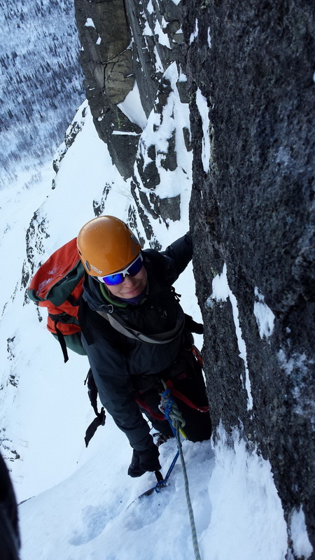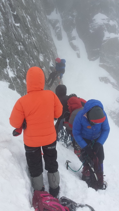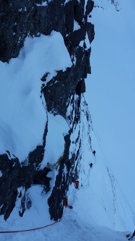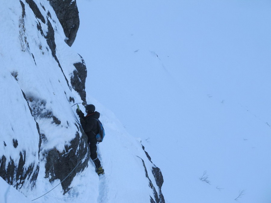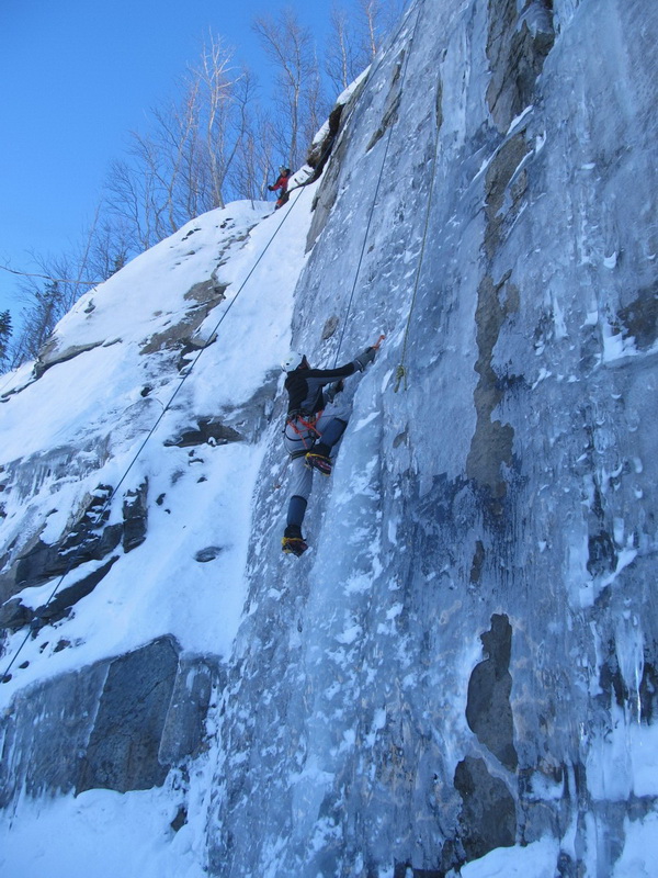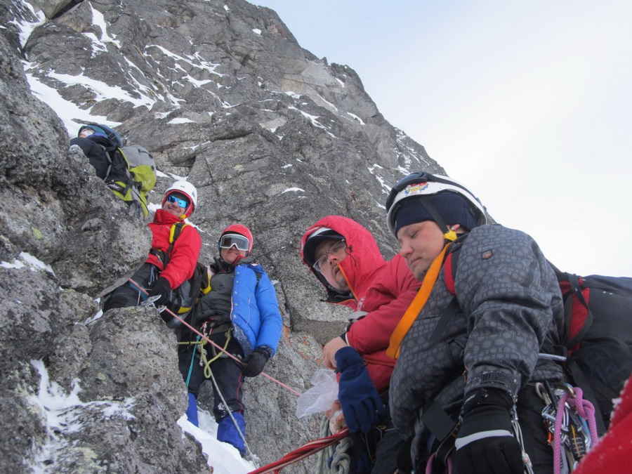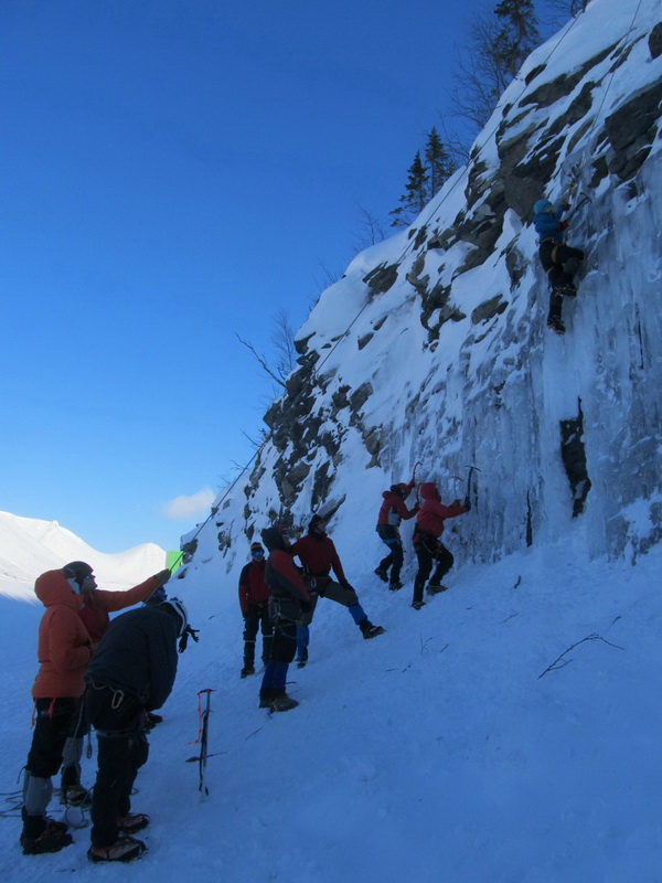 На подходе к маршрутам нас опять ждал сюрприз – на Иксе работает группа. Делала она это крайне медленно, поэтому все 16 человек пошли проходить Расщелину. Маршрут давался всем легко, за исключением ключа. Ключ представлял себя обледеневший скальный камин с вертикальной стенкой в конце. Вертикальное лазание в кошках по обледеневшим скалам было в новинку почти всем. Лишь только несколько человек рискнули пройти его с нижней страховкой. Остальные использовали перила и шли на схватах или жумарах.