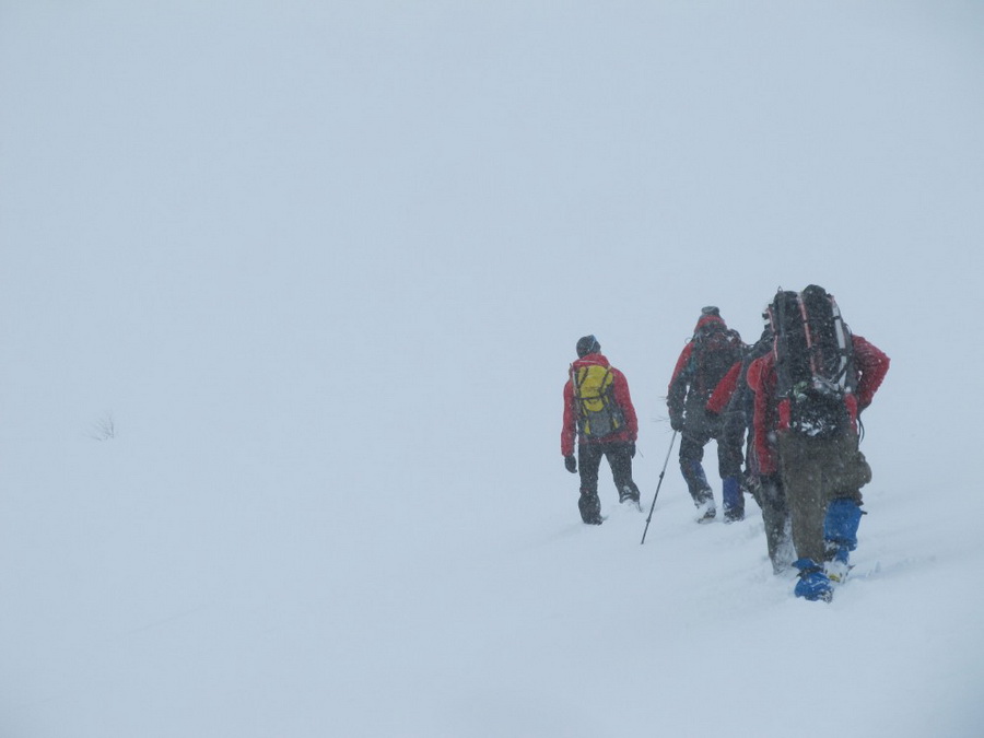 Когда вышли к скалам, погода осложнилась сильным порывистым ветром. Тренировка проходила в экстремальных погодных условиях. Часть группы занималась драйтулингом, другие делали ИТО, а третьи просто вырыли себе на снежном склоне глубокие ямы, чтобы защититься от ветра, и разглядывали первых и вторых.