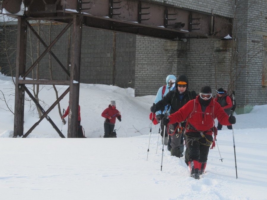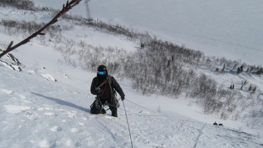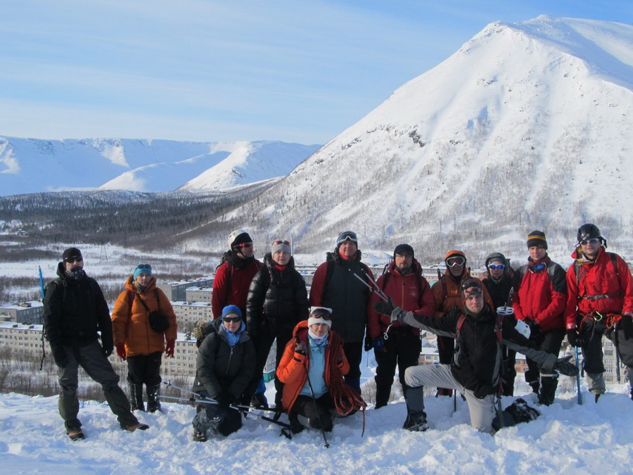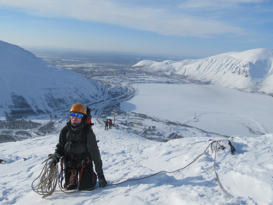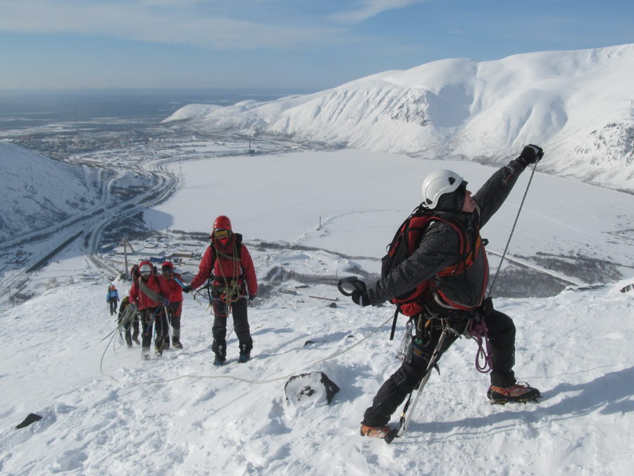Наконец-то установилась погода. Солнечно и мороз около 10 градусов. До Юкспора доехали на городском автобусе. Вообще, это у меня в жизни впервые, когда на восхождения едешь на общественном транспорте. Мы неплохо изучили его расписание и пользовались ежедневно. Единичка Б на Юкспор не предвещала сложностей. Решили идти два параллельных маршрута с общей встречей на гребне. Но на практике вышло совсем все по-другому. Во первых звено Смирнова промахнулось со своим треком и вышло на маршрут звена Полянской. А во-вторых в Хибинах начались соревнования по альпинизму, и на гору одновременно лезло около тридцати человек. На склоне началась неразбериха, в которой мы в полной мере поучаствовали. Но, тем не менее, на гору мы забрались первыми из всех. Правда, девушки немного нервничали, и нам пришлось провесить для них почти весь гребень и на подъеме, и на спуске.