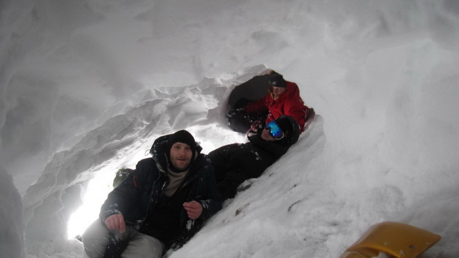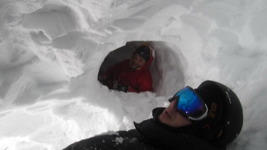 Новички учились ходить и взаимодействовать на снегу. Вторая подгруппа изучала устройство пещер. Общими трудами за пару часов выкопали многоуровневую пещеру, в которой запросто может уместиться десяток человек.