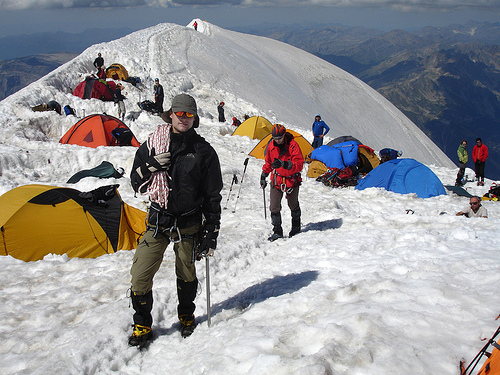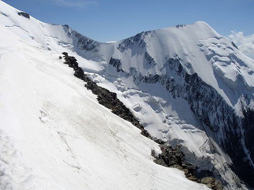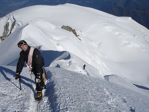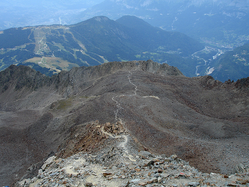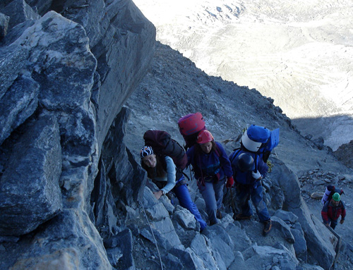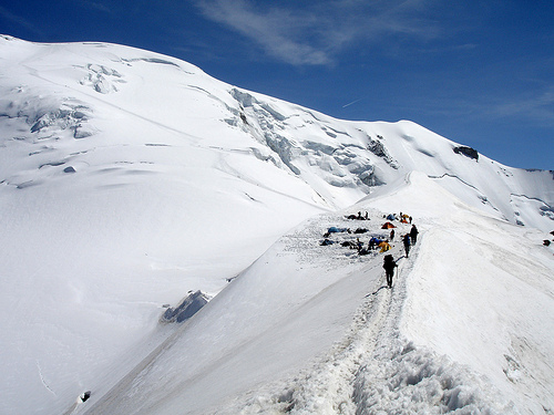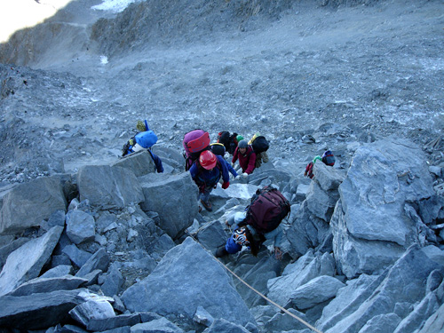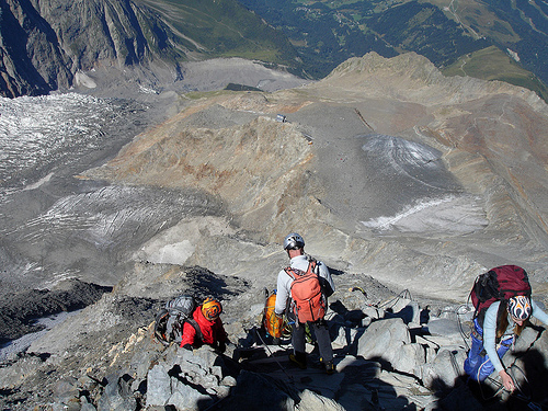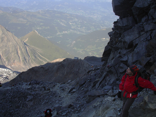 Сразу после ледника резкий подъем, а за ним место названное «grand couloir». С виду простейшая «сыпуха». Понимаешь смысл названия только когда, незнающая границ общность туристов, предупреждает криками. Поднимаю голову и вижу летящие - как баскетбольные мячи - камни. Подпрыгивают, вращаются, выбирают из «сыпухи» еще камни… Ё-моё! Вот почему народ идет в касках! Уже пройдя кулуар, и мы, и вышеушедшие группы, или те, кто спускается с вершины, с регулярной периодичностью оглашают гору предупреждениями о камнепаде на всех возможных языках.