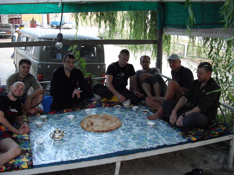 Ехать нам, считай, было не много, - километров 300. Но дорога чаще была нехороша, чем хороша. Легкой передышкой был ужин в чайхане (без водки). Молодая женщина в паранже разносила еду. Прибыли последовательно чай, лаваш, жидкий сыр, овощи, жреная баранина с подливой. Вечерело. Спадала жара. Поднимая пыль, по дороге ползли грузовики китайского производства. Бараньи кости бросали в сторонку, где не нагло ошивались воспитанные, хоть и задрипанные местные собачки.