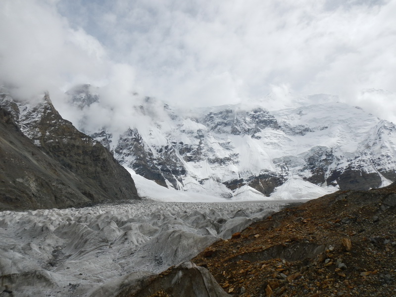 Решили, что пойдем по левому (орографически), противоположенному от нас рантклювту. Но пересечь ледник (не используя веревки, кошки и ледобуры) никак не получалось. Он был весь испещрен разломами. Я был настроен на радикальный путь в лоб, но Максим старательно старался избегать трудностей. Пришлось спуститься более чем на километр вниз по правой стороне Фортамбека, пересечь его, где стало возможным, и затем набирать высоту обратно уже по левому рантклювту. Шлось по нему плохо. Было камнеопасно. Периодически рантклювт обрывался большими озерами. Часто приходилось возвращаться назад и искать обходные дороги. Средняя скорость движения 500-1000м в час.