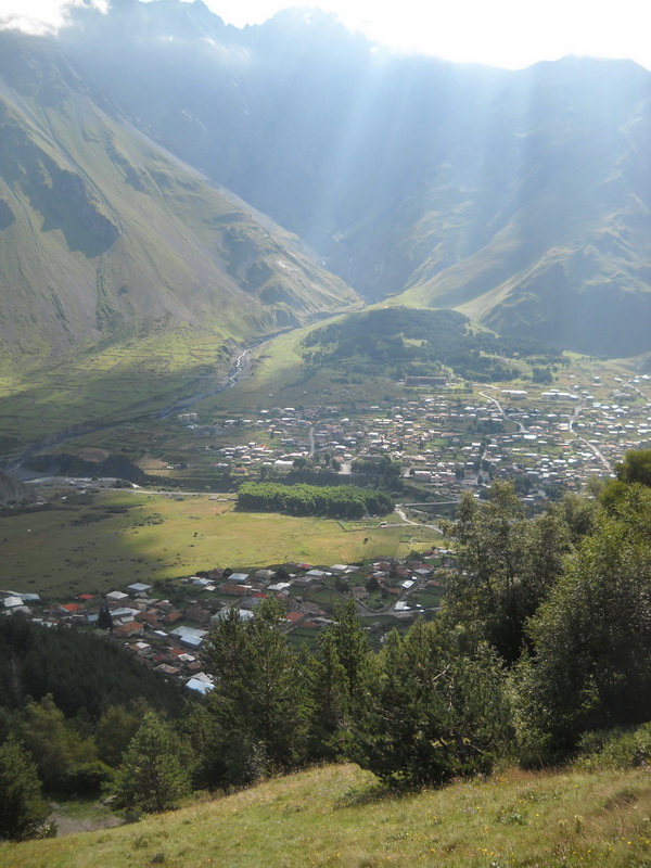Степанцминда и Гергети, вид с тропы к монастырю