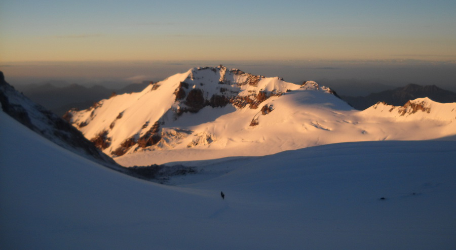 Идем вверх уже часа четыре - пять. Ползем, останавливаемся, отдыхаем, снова ползем. Не растягиваемся, темп у всех практически одинаковый. Идем по северному склону, солнце взошло, но пока еще где-то за Казбеком. По-прежнему холодно, но до извлечения из рюкзака пуховки дело не доходит. Внизу огромное фирновое поле, ни пути подъема, ни вершины не видно. Впереди только длинный склон с крутизной градусов 40, мы потихоньку траверсируем его, постепенно набирая высоту. Четкие следы идущих выше и натоптанные в свежем снегу ступени не оставляют сомнений – идем правильно! Хотя по просмотренным дома многочисленным фото я представлял себе путь подъема совсем иначе. Уже видны внизу облака в соседних ущельях, а впереди по-прежнему перегиб за перегибом. Идем «на самостраховке», то есть каждый сам по себе. Склон крутой и до снежного поля внизу довольно далеко, так что оступиться и поехать вниз – перспектива совсем не радостная. Но и не сильно опасная – ни скальных выходов, ни трещин.