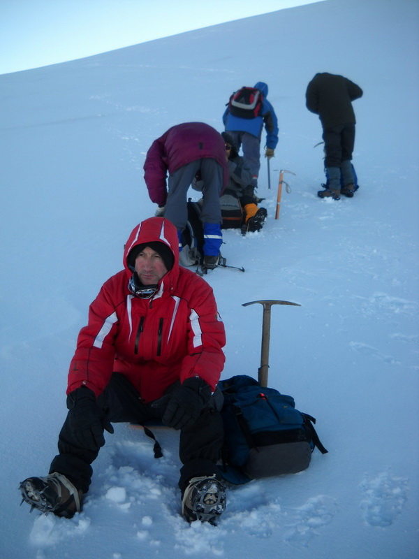 Чуть опоздали с выходом, луна уже села за хребет, темно. Идем при свете фонарей. Вчерашний снег позволяет видеть следы прошедших перед нами, так что проблем с ориентированием нет. В какой-то момент в лучах фонарей начинает светиться туман, испугав всех. Да нет, это не облако, просто идем возле ручья. Все прихвачено морозом, но льда на камнях нет и совсем не скользко. Осыпная тропа переходит в закрытый ледник, выше и ниже нас видим редкие фонари других восходителей. Садимся передохнуть, и к нам подходят трое поляков, с которыми вчера сидел за столом. Им явно что-то надо – оказывается, солнцезащитные очки! Собрались ребята наверх, однако. Вспоминаю, что запасные очки у меня есть, и в шутку говорю, что они дорого обойдутся. Нашел с кем о деньгах шутить, парень расстраивается и что-то начинает объяснять о том, что он студент и денег совсем мало. Успокаиваю, вручаю очки и прошу вернуть внизу по возвращению.
