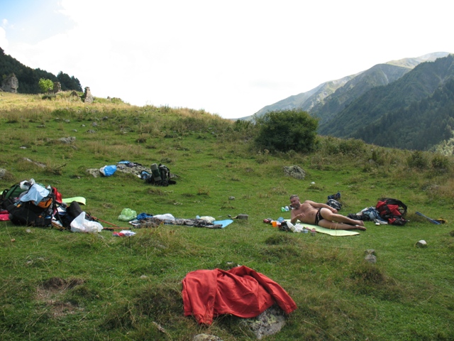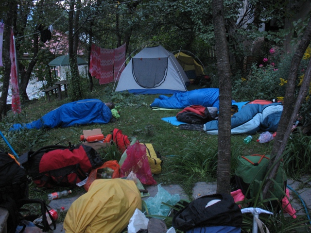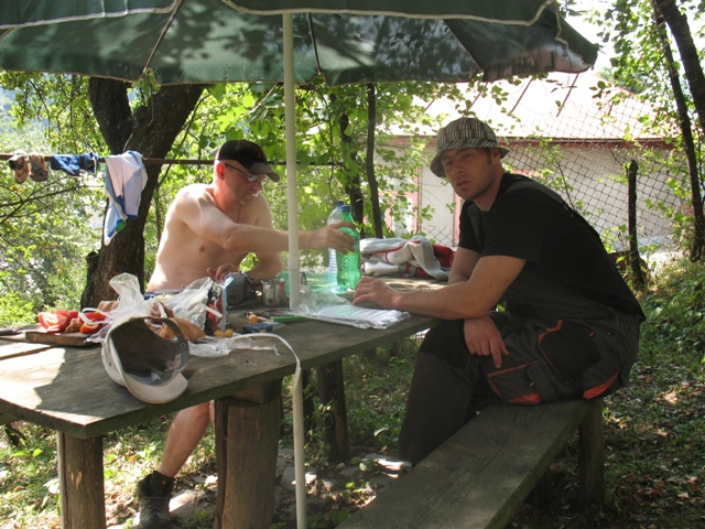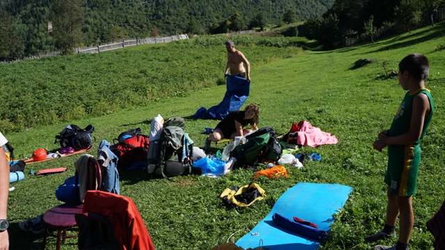 Решили переделить заброску. Ребята взяли на себя большую часть груза. А девочкам достались остатки, в среднем 25-27 кг. на душу. Их поднимать было тяжеловато, поэтому Полковник и Руся любезно помогали одевать рюкзаки девушкам. Но места для груш, которыми угощали хозяева дома, все-таки нашлось. Дележка имущества сопровождалась употреблением разведенного спирта и беседами о наших странах с Костей.