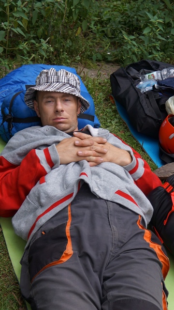 По возвращению мы застали следующую картину: Русьянов, слегка в приподнятом алкоголем настроении, сложил самые тяжелые вещи в рюкзак и собирался выдвигаться на маршрут, несмотря на то, что рюкзак был неподъемный.