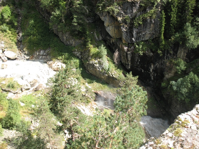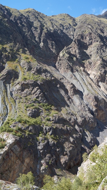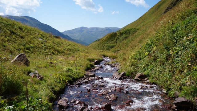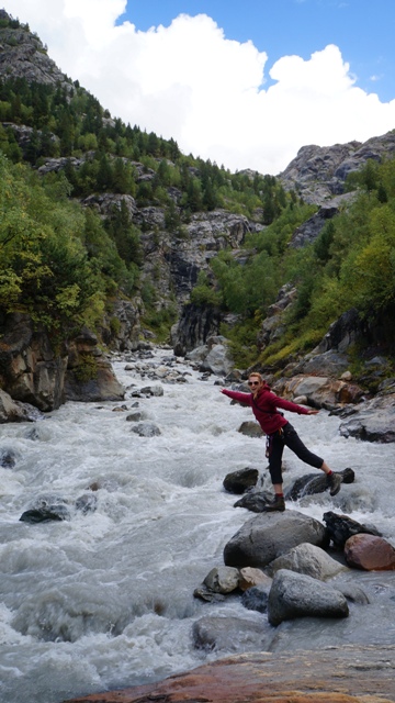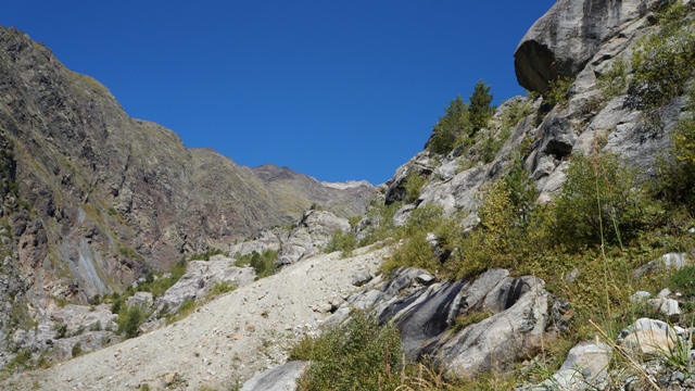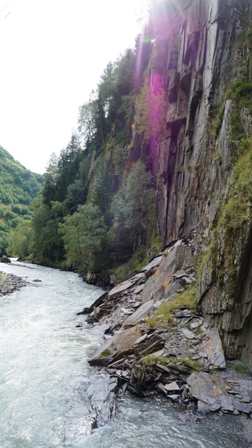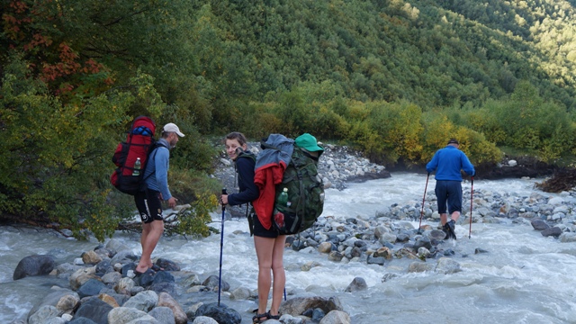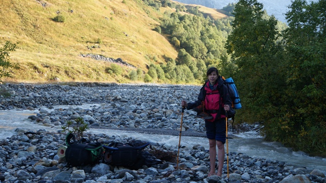 Дальше тропа уходила резко вниз. По сыпухе и камням траверсом спустились к реке «Цанери», здесь она была не такая буйная и широкая, а спокойным ровно-ламинарным течением пробегала мимо
