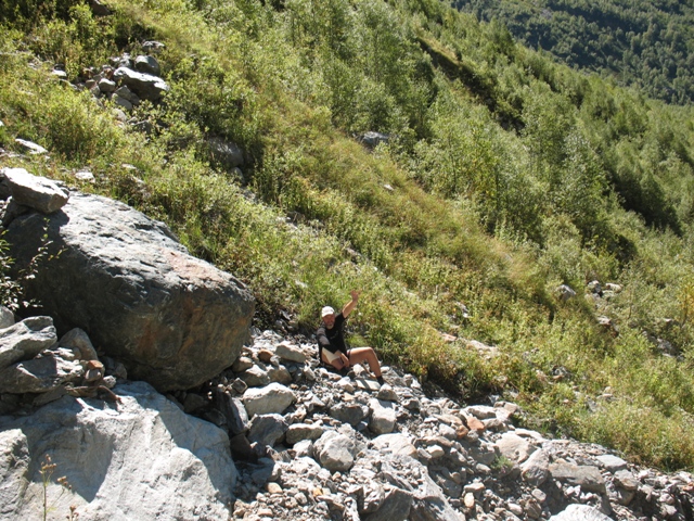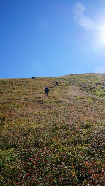 До верхнего гребня добирались около часа, но вот последний рывок дался нелегко: крутой подъем на гребень сопровождался и небольшими камнями и сыпухой. Удобнее всего было идти до верха по траве, ведь можно было хотя бы цепляться за растительность и подтягиваться руками. Каждый пошел своим путем и вроде бы и ничего, почти все дошли. Но Русе, под тяжестью ноши, было тяжелее всего: он просто соскальзывал, и выше подниматься было бы ему нежелательно.
