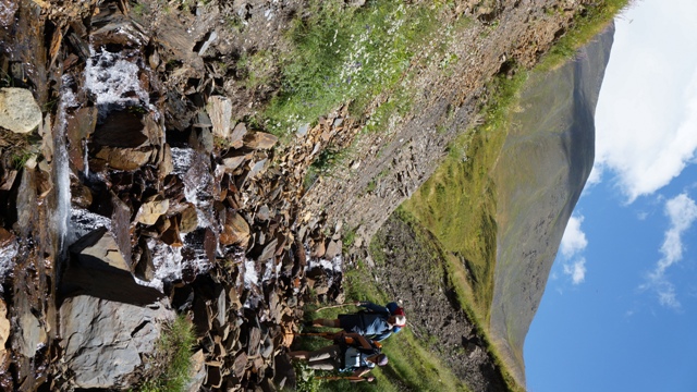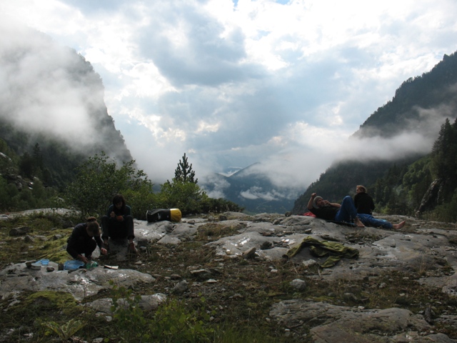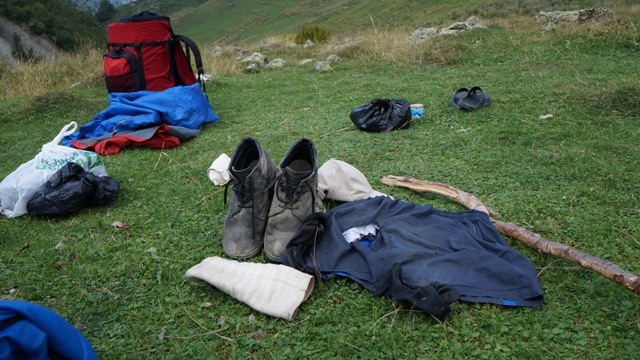 07.09 Утро началось с комментариев Руси о бегавшей по нему ночью мышке. Также ее следы, точнее помет, обнаружили около наших рюкзаков, но они были они нетронуты ночным гостем-грызуном. На завтрак решили приготовить грибной супчик, ведь грибов у нас был целый пакет. Девочки приступили к работе, а Руся пошел искать источник нарзана, про который накануне поведали нам местные жители. До него, по рассказам сванов, было километра 2-3. Погода была замечательная и предвещала хороший ходовой день.