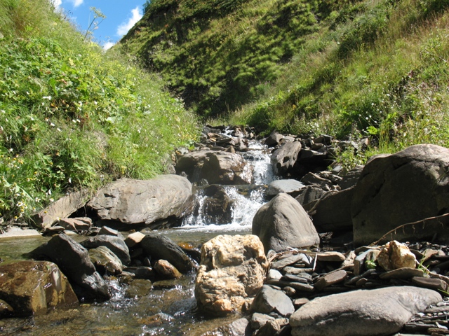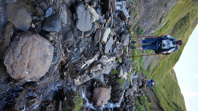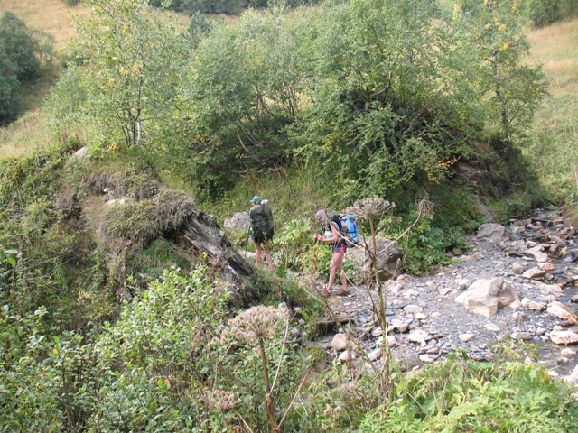 Лагерь собрали достаточно быстро стали на маршрут. Но, касательно дальнейшей дороги были легкие разногласия, так как тропа расходилась в противоположных направлениях. Решили налево не поворачивать. Пошли направо, но тропа часто терялась, поэтому дальше пошли по ручью, а Руся решил пойти немного выше. Но через пол часа догнал основной состав, весь взволнованный с впечатлениями от увиденного: тропа Руси обрывалась достаточно резко и уходила вниз. Руся еле успел остановиться. По ручью скакали уже полным составом. По одному берегу идти было сложновато, так как не везде была возможность пройти, поэтому все время приходилось ручей переходить то на правый, то на левый берег.