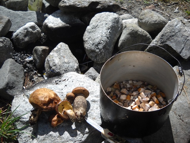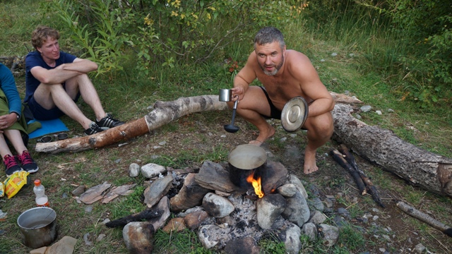 Договорились о прибытии лошадей в течении получаса (так как мы были уже в курсе пунктуальности этого народа, то не рассчитывали их увидеть даже через часа два). В это время приступили к приготовлению ужина: грибного супа. Русьянов организовал шикарный костер, подложив красиво большие камни для размещения котелка с супом.
