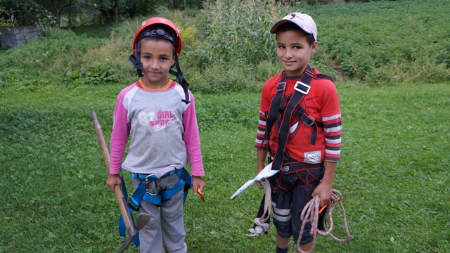 Руся очень быстро подружился с детьми. Он начал разбирать палатку и тут же у него нашлось много юных помощников. Расставив палатку, Андрюха достал обвязки, карабины, шлемы и начал одевать ребят. Мальчики были в восторге!