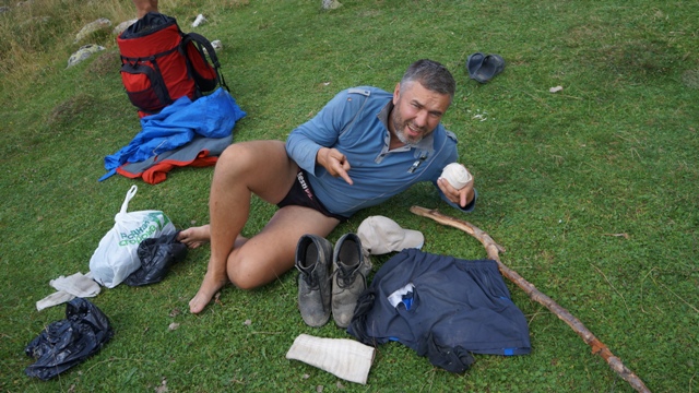 Но после окончания дождя и надежда угасла. Обшарив все соседние кулуары, поняли, что 2 литра воды нам надо растянуть как минимум до обеда завтрашнего дня. Ужин отменили, употребление спирта так же на этот вечер было под запретом. Пожарили в кастрюле сало и заточили его с остатками лаваша, который купили в последней деревне. Догнались орешками и сухофруктами. Почти здоровое питание)).