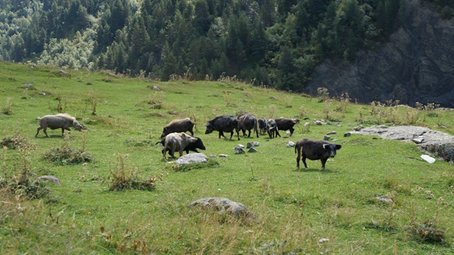Не все сразу и заметили стадо пасущихся свинок. Они на тот момент далековато от нас находились, поэтому сложно было их рассмотреть хорошо, но в течении часа они ворвались с веселым похрюкиванием в наш лагерь. Такие забавные, розово-черные хрюши отличаются существенно от наших свиней, во-первых, размерами: эти мелковаты по сравнению с нашими и выглядят достаточно спортивно, большие ушки, во-вторых, волосяной покров: тушка покрыта длинной грубой шерстью. Русьянов был очень рад их появлению! А учитывая, что они еще и периодически спаривались, то вызывали массу комментариев со стороны Руси в свой адрес.
