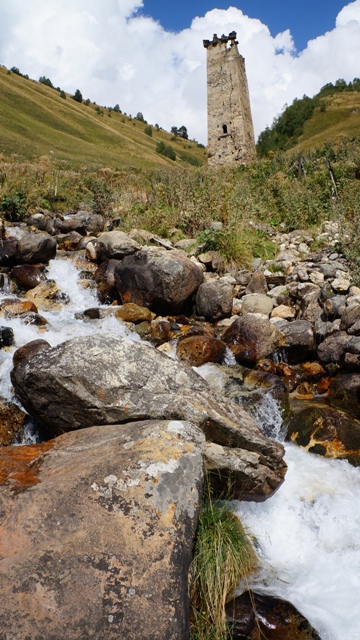 Мы начали спускаться в деревню и всю дорогу оживленно обсуждали предполагаемое место хранения заброски. Поделившись воспоминаниями о месте, куда нас отвозил Гига, наши поиски сузились до трех домов, около которых стояли каменные башни ( но их в деревне оказалось многовато). Решили по очереди посетить все три.