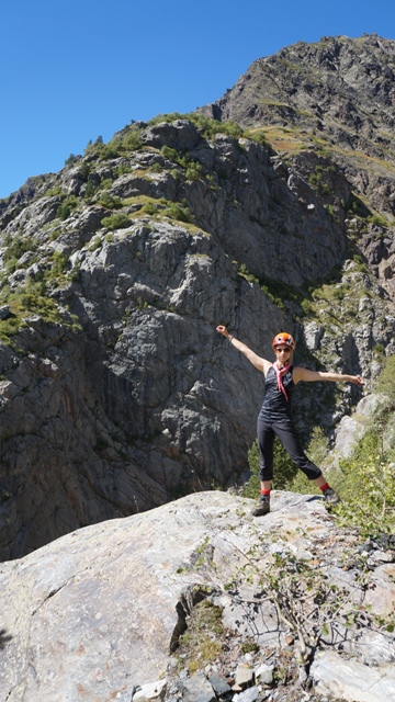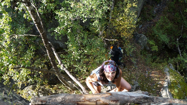 Сыпуху с рюкзаками было сложнее преодолевать, но все справились, тем более рюкзаки были уже не такие тяжелые. Три гребня сыпухи прошли достаточно быстро, а дальше полезли в скалы. Оставленные накануне турики, очень облегчали маршрут, шли быстро и без разведок. Дальше уже начались сложности: постоянно приходилось останавливаться и искать дорогу. Лезть по «бараньим лбам» было не просто, тем более, что 99% троп заканчивались обрывами. Последний кусок подъема по «бараньим лбам» разведал Полковник, правда, спустив, на остальных пару камней, но, тем не менее, участок со скалами мы преодолели.