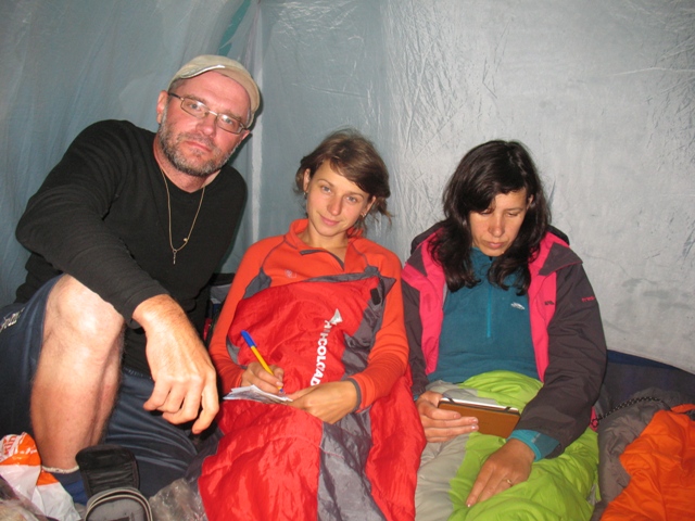 Град не прекращался. А, учитывая, что все были одеты достаточно легко, промокли и промерзли быстро. Разобрав палатку, все погрузились внутрь и начали утепляться и отогреваться. И тут появилась новая проблема – почти не осталось питьевой воды. Обшарив все закрома рюкзаков, насобирали 2 литра воды…, а нас пятеро, но еще теплилась надежда найти ручейки в районе нашей стоянки.
