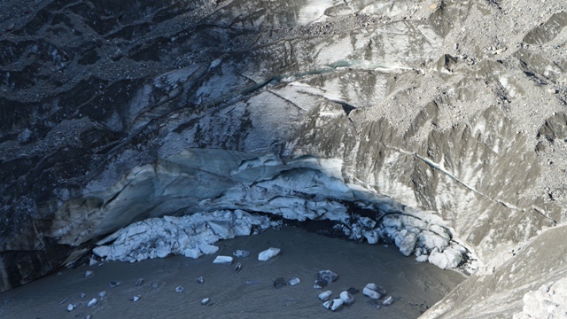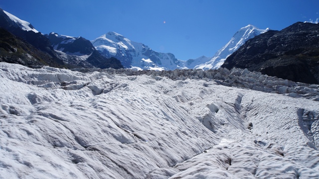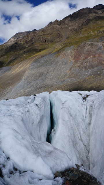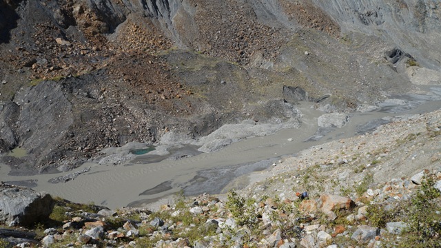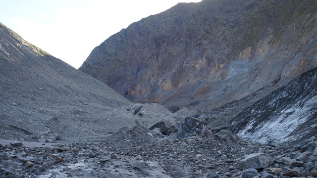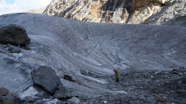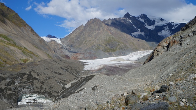 Ледниковая морена представляла собой долину заваленную камнями. Местами просматривался лед, но он был серый и грязный. Было слышно, как тает ледник, и под ногами струились ниточки ручейков, а большие расщелины приходилось обходить. Зона была мертвая. Никакой растительности и животинушки не просматривалось, но идеальной тишины не было, так как срывались с гор водопады воды и, создавалось впечатление, что недалеко находиться автомагистраль. Кошки не одевали, так как ледник был не скользким, а проблемные места хорошо просматривалсь.