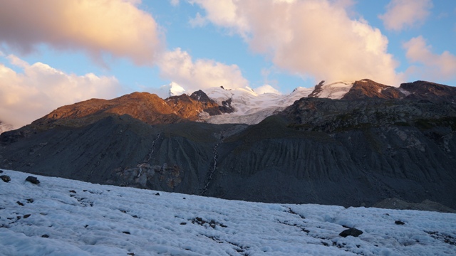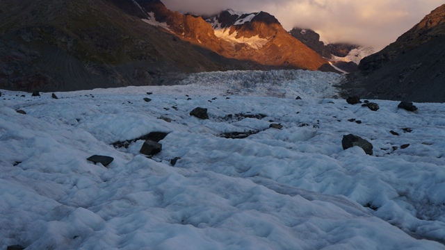 Шли долго и только к вечеру, когда уже солнце спряталось за верхушки гор, и стало значительно холодно, дошли до развилки: налево уходил ледник Цанер, а направо – ледник Оиш вздымался на перевал Добровольского. Весь изломанный призмами сераков, расчленный трещинами. На границе средней и верхней трети длинника подъема обнажался зловещий круглый нунатак. Просматривался очень красивый вид на снежные вершины пятитысячников. В сторону перевала Добровольского образовались ледяные зубья.