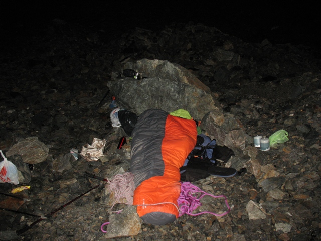 Расчистили площадочку для сна. Обложили ее камнями и постелили мусорные пакеты, которые забыли выложить из рюкзака. Выложили все из рюкзаков и постелили их вместо подложек. Все теплые вещи, да и вообще все, которые были с собой, одели на себя. Пока делали спальное место Полковник сходил за водой. Начали готовить ужин. Пришлось открыть «кирпичи» второй группы, которые несли, так как своей еды было мало. Хорошо, что горелку захватили. Спальник у нас был один на троих. Полковник поступил как джентльмен и отказался от него, так как у нег с собой были теплые штаны и пуховка.