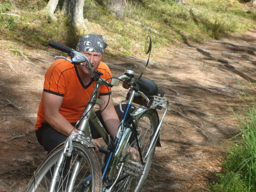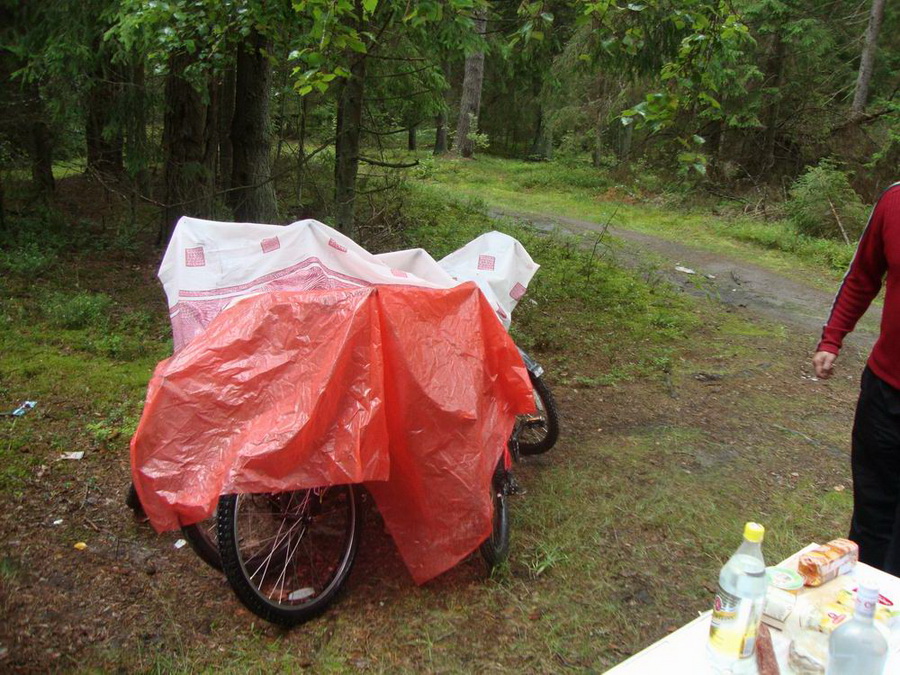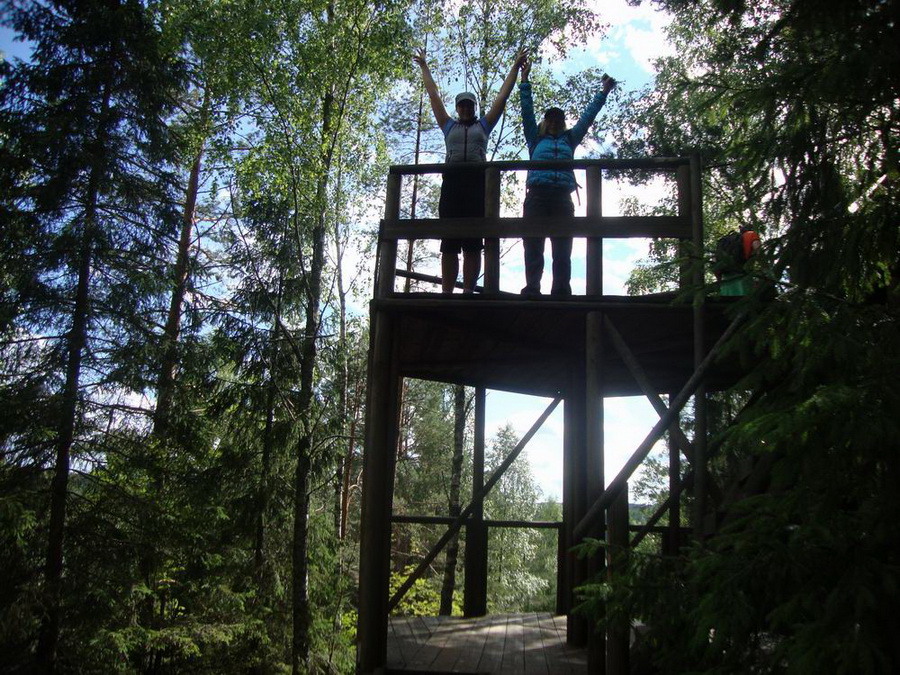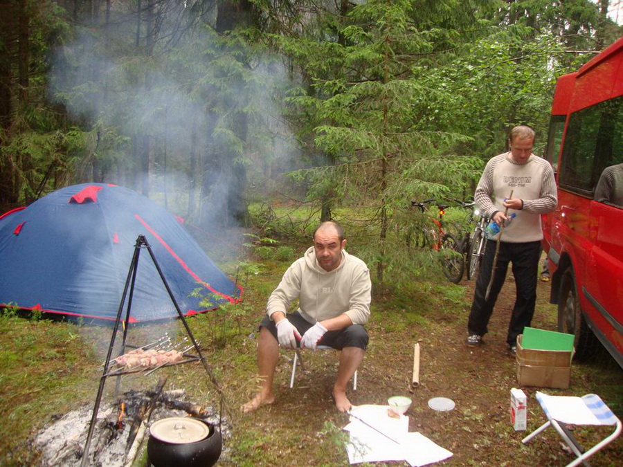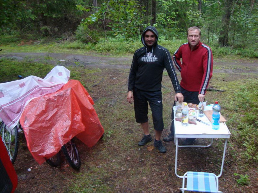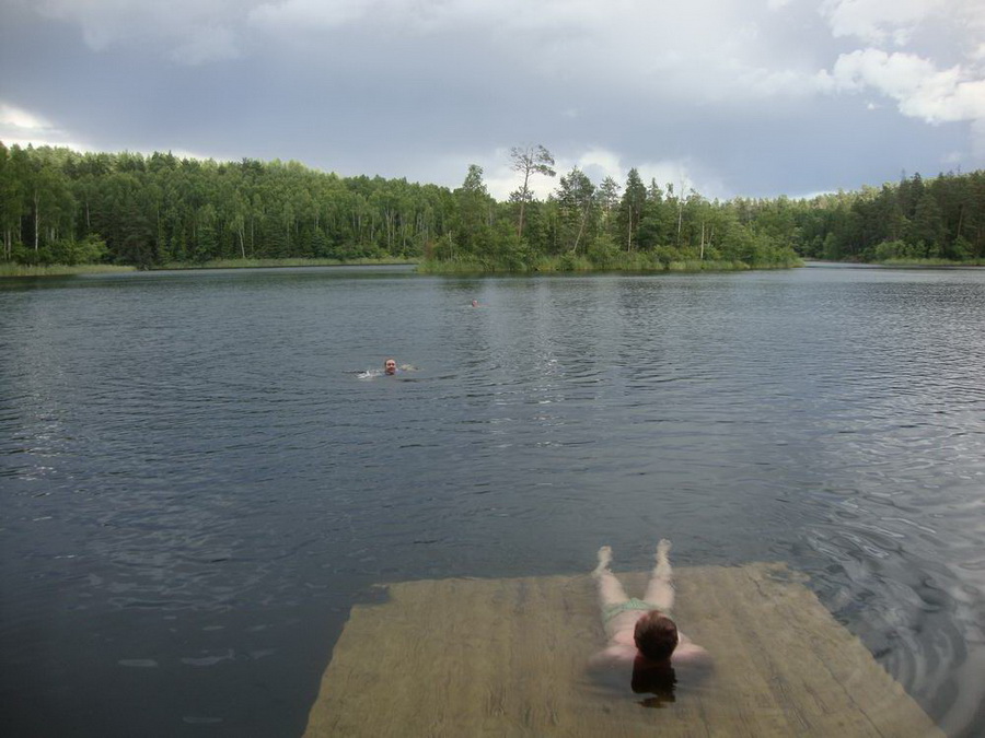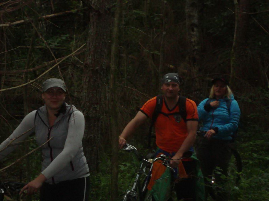 А теперь немного о том, как намедни, 20-21 июля, была сделана вылазка к местам предстоящего похода с целью рекогносцировки места сборки (лагеря). Группа из 4-х человек прибыла из Минска к заповеднику «Голубые озера» только к 15-00. Оставив микробус в чаще, недалеко от экологической тропы, наскоро перекусив и подогревшись, мы (Миндибеков М., его друг Миша, Таня, Катя) сели на велики и поехали исследовать местность. Разведка оказалась очень удачной – место стоянки было найдено, путь к нему запомнили. И хоть погода особо не радовала, удовольствие было получено огромное, особенно от разноплановых покатушек. Вот небольшой фотоотчет (с комментариями).