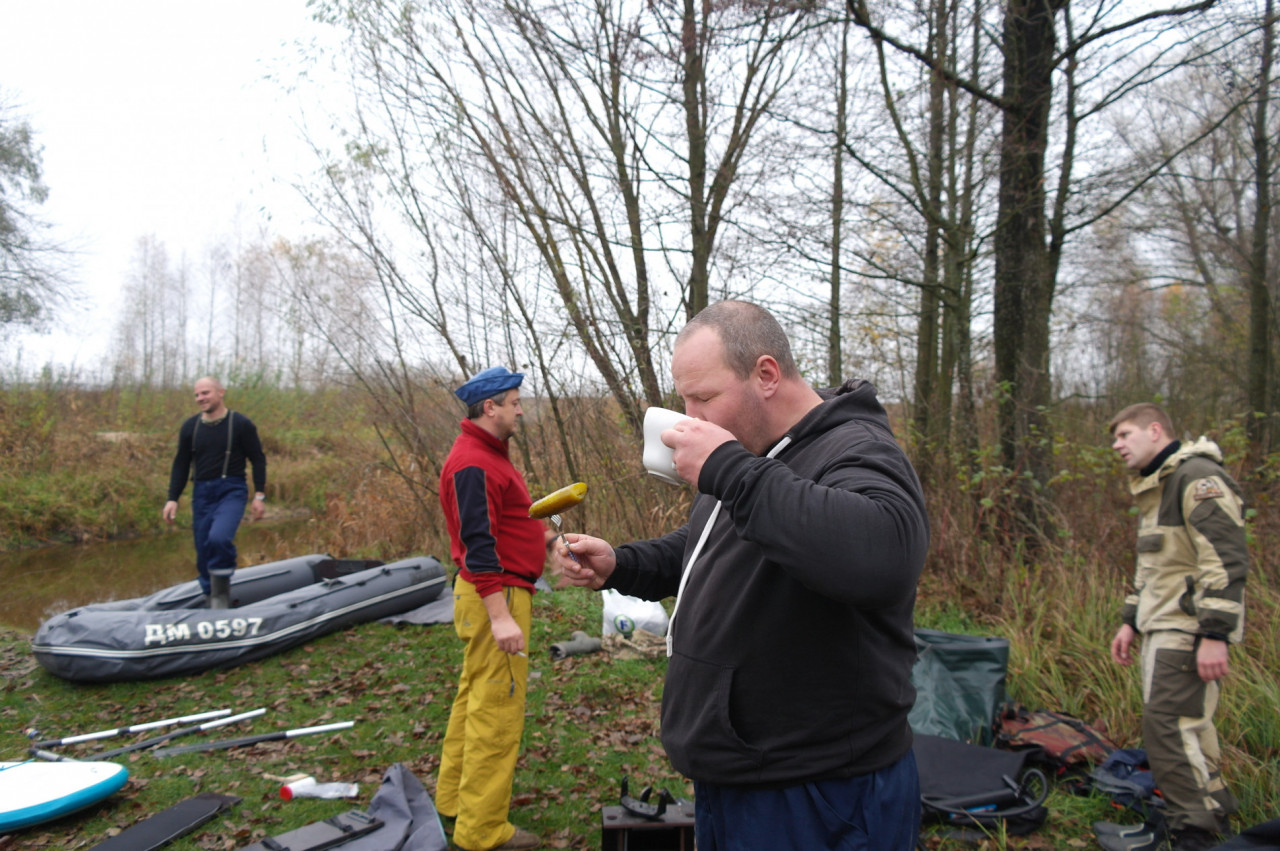 Разбудили Пузо. Он переохладился во сне и тотчас начал интенсивно содрогаться. К неудовольствию Баскова и ко всеобщему тоже на бусе им пришлось ехать именно сюда. Бус до дамбы не доехал метров триста (глубокая колея). Оттуда за лодкой на помощь пришел авангард во главе с Олегом Соловьевым. Олег со свойственной ему экспрессией начал хуесосить. Дескать, он хороший, мы плохие.
