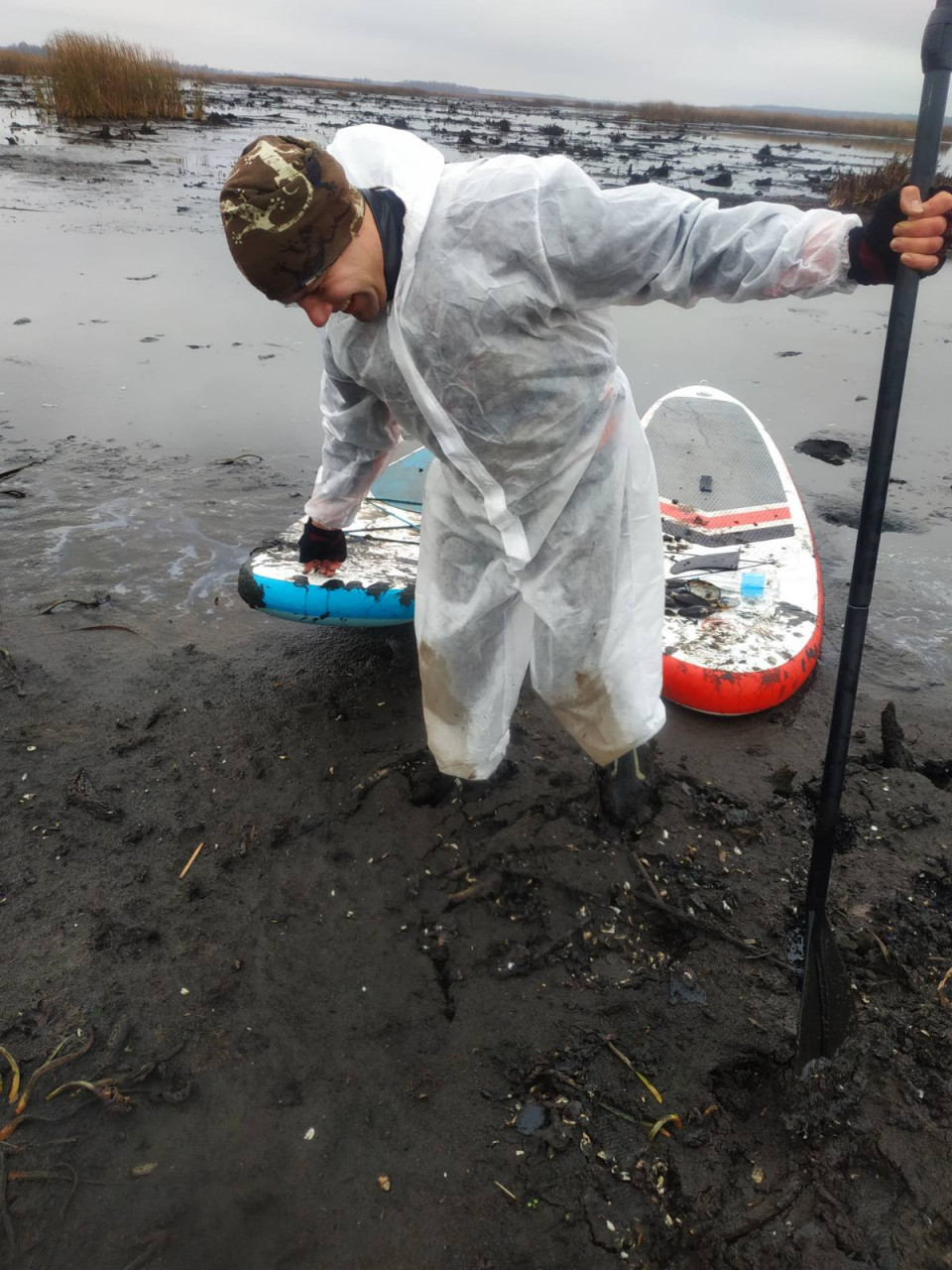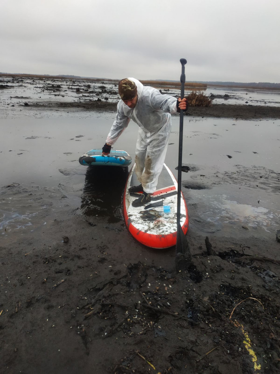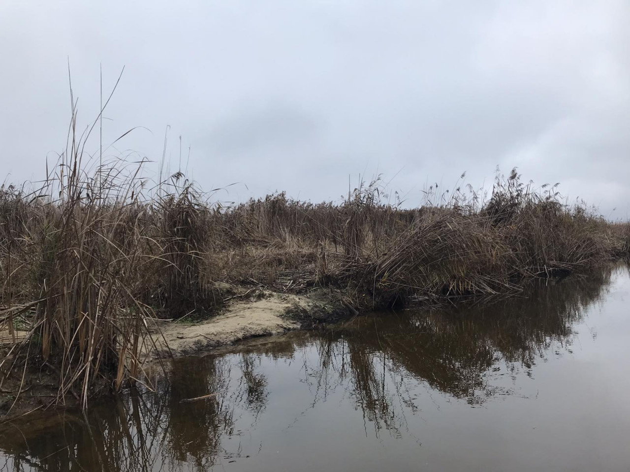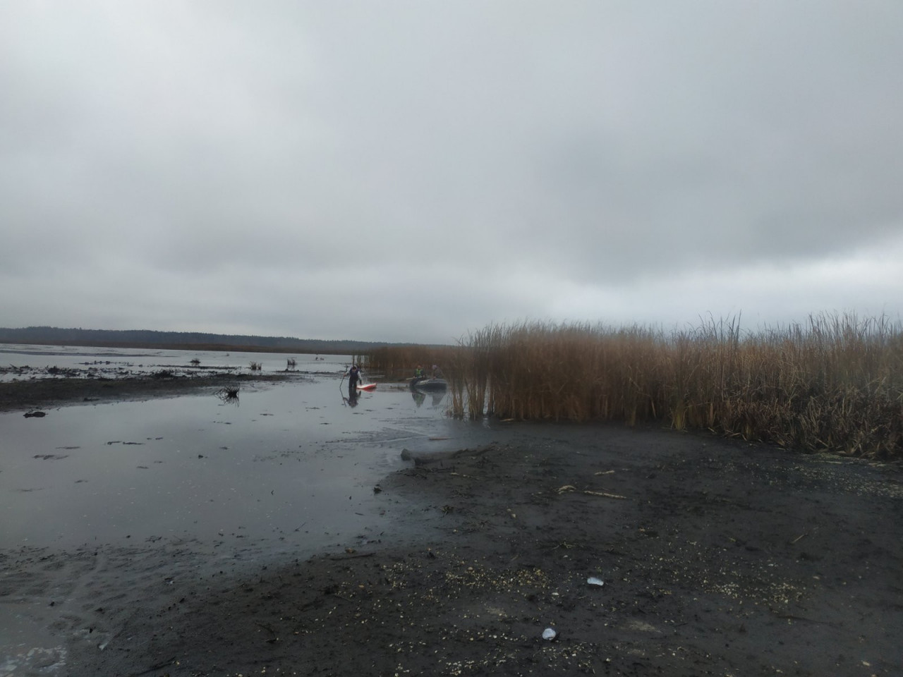 Неожиданно Дима Погодин стал поднимать ногу мотора. А белый бурун из-под винта сделался черным. И что самое ужасное несколько раз мы ударились о пеньки!! Вот он виден вход в канал. А чтобы попасть на западный берег и не ломиться через тростник требовалось как раз по этому каналу ехать к берегу. Но что это… А где же вода!? Колом встала лодка, заглушили мотор и начали проталкиваться веслами. Да и сапы дальше ехать не смогли. Берег он вот, рукой подать. Но почему нет воды?! Есть разве смазка и метр ила. Я опрометчиво попробовал выйти. Тотчас обе ноги засосало в грязь самой говнообразной консистенции. Как страшно должно быть тонуть в болоте! Благо есть сап. Взявшись за него руками поперек, проделывая фрикционные движения и при этом, затрачивая колоссальное количество энергии, кое-как на него взгромоздился. Причем с одышкой. Канал действительно наш. Он ровной полоской уходил вдаль. Чуть более километра было до берега. А там лагерь и суп лагман. Это не ошибка. И навигатор показывает, что он, канал наш. Только где же в нем вода!? Кое-как двадцать метров я дотолкал сап до берега. Какой там канал. Коллектив тоже был обескуражен. Но при этом все оставались необычайно веселыми. Доселе белые костюмы тотчас сплошь вымазались в зловещую говнообразную грязь. Настолько мелкодисперсную и торфяную, что больше походила она на строительную замазку!