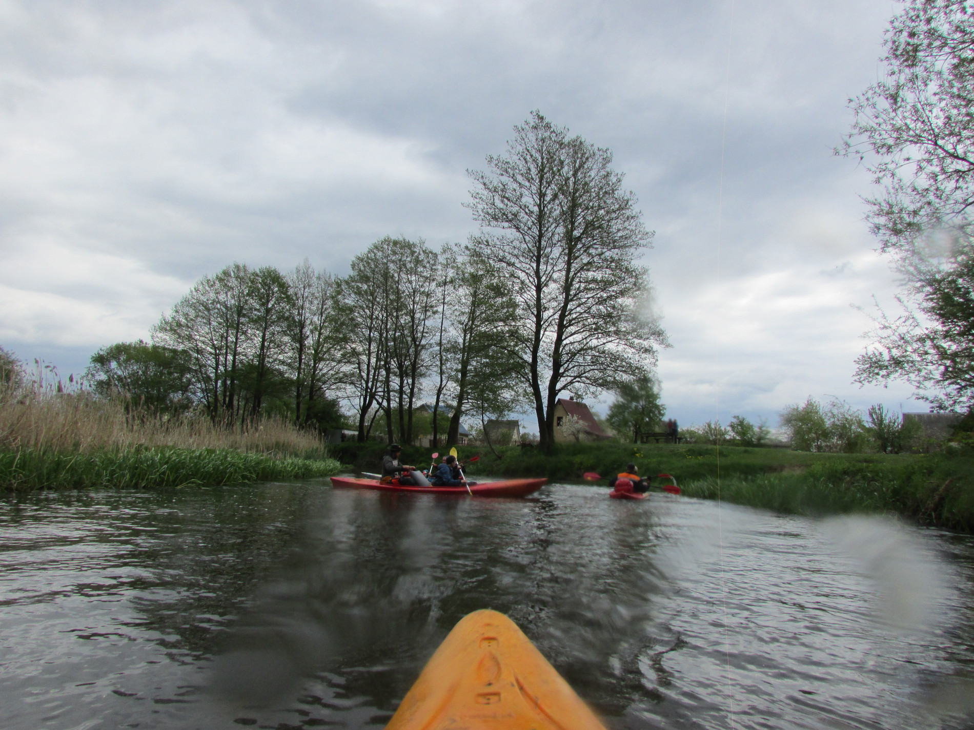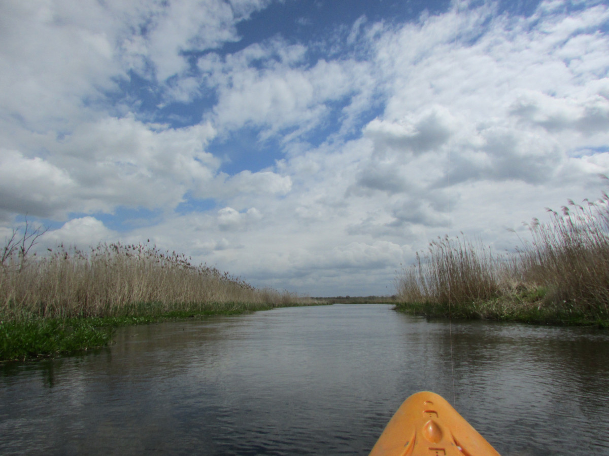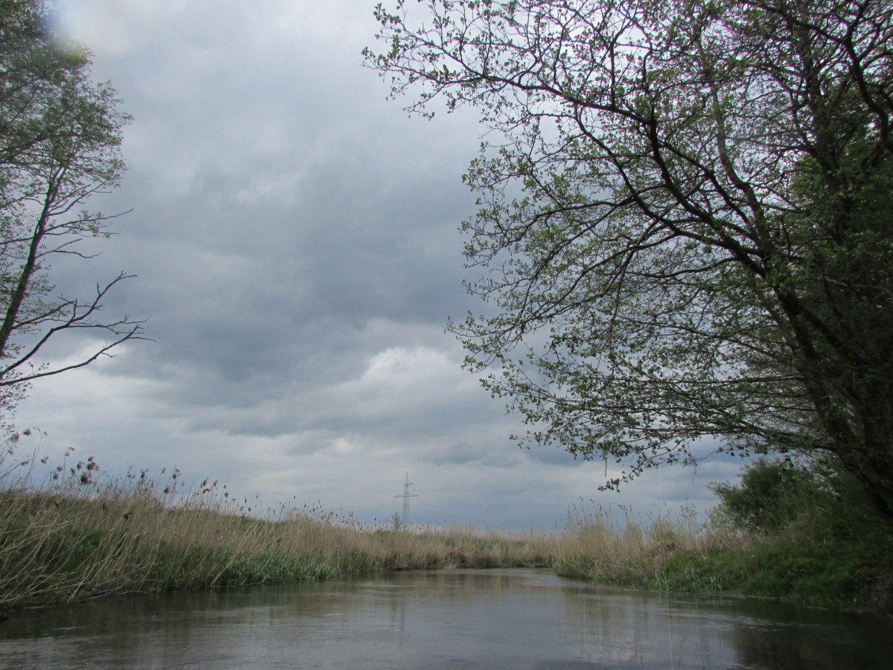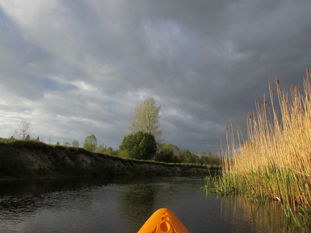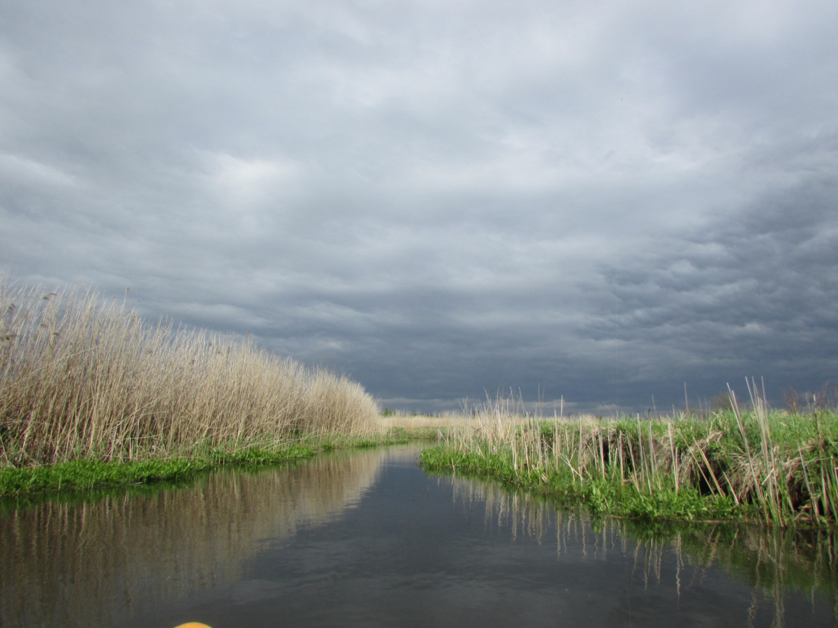 Вначале река шла широко, просторно. Камышовая бледная стена вдоль берега прятала от нас зеленые весенние пейзажи. Сплошь серое небо. По нему стремительно неслись сизые тучи, гонимые ветром.