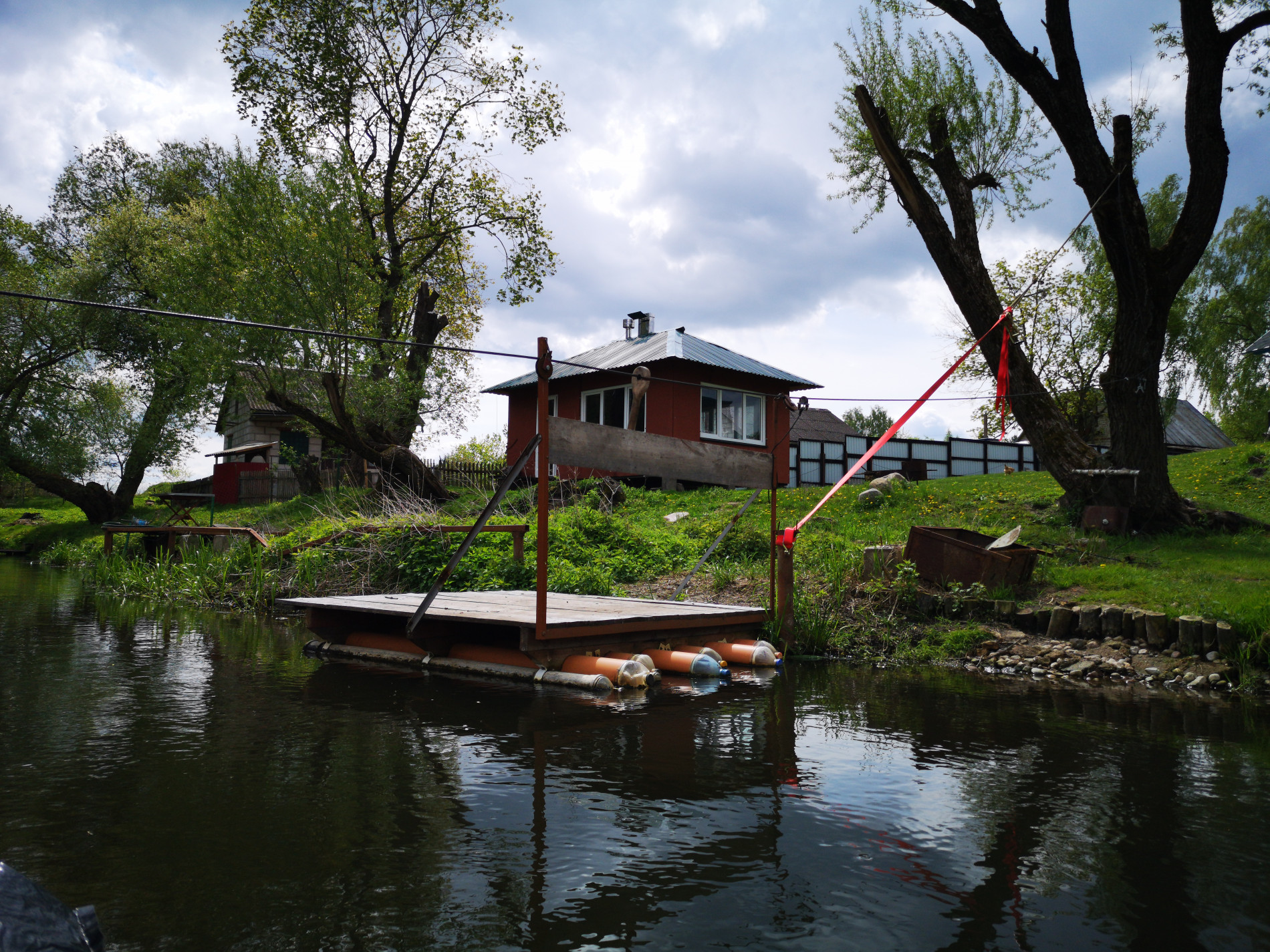 Сегодня населенка встречалась часто. В основном дачные домики. Но это не напрягало. Некоторые участки мы даже разглядывали с интересом. Вот кто-то соорудил подобие пристани. На воде платформа держалась на пластмассовых сосудах. А от пристани натянут канат на другой берег. Были и совершенно пляжные, вероятно, специально расчищенные и засыпанные желтым песочком прибрежные участки. Где-то выглядывали из-за изгороди козы. Матерый, с витыми длинными рогами, с окладистой бородой самец сурово оглядывал нас. Рядом с ним прыгали любопытные, несмышленые козлята.