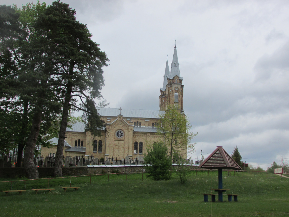 Весенний запах бодрил и будоражил. Здесь смешались молодая свежая зелень, сырая земля, речная вода, ароматы цветущих кустов. Ветер не унимался, но был он попутный. Где-то вдали на правом берегу показалось конусовидное кирпичное строение с куполообразной крышей. Мы сразу догадались, что это мельница. О ней нам рассказывал Игорь Пузочес. Чем примечательна та мельница большинство из нас так и не узнали. Зато посетили католический храм 1900-1905гг постройки. На территории, прилегающей к костелу, располагалось кладбище. Примечательно то, что захоронены там не только, как водится, ксензы, но и люди, не являющиеся служителями костела (судя по количеству могил). На берегу рядом с ним была симпатичная поляна. Но чрезвычайно ветреная. Здесь был завтрак.
