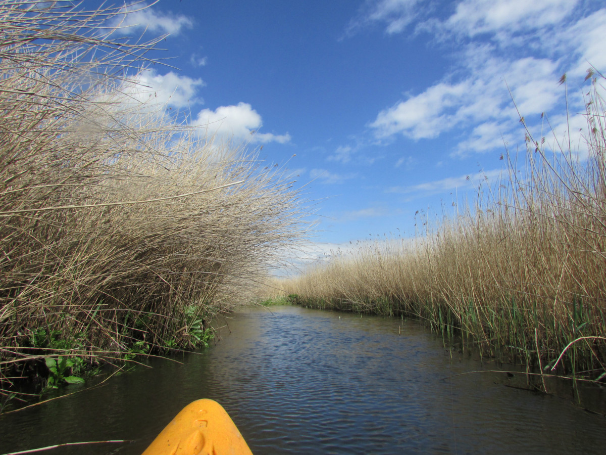 Часто меняющаяся сегодня погода меняла и цветовую гамму пейзажей вокруг. Сизое, с пышными словно вата тучами, небо вдруг становилось ярко голубым, и по нему уже ползли редкие белые облака-барашки. Или вдруг стихал ветер. И тогда волнистая поверхность воды начинала ровно отражать грифельное небо, тусклые прошлогодние камыши. Контрастно зеленела полоска травы у самой воды. Со дна к поверхности тянулись яркие зеленые водоросли. Напоминая, что весна оживила и подводную растительность.