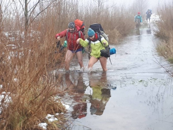 До конца года продолжалась высокая концентрация событий. Декабрь вопреки предыдущему году вышел совсем гнилым и унылым месяцем. Изредка подмораживало, выпадал даже снег, но солнечных дней практически не было. С неба валилось все время промозглое влажное сеево.16-17 декабря с железнодорожной станции Колосово отправилась группа пешим порядком под руководством Волосачаз Сергея (замена по причине получившего травму Смирнова). 13 туристов были настроены решительно и даже взяли снаряжение для переправы через Неман. От неимоверной и не характерной для декабря распутицы переправа через разбухший Неман стала невозможной. Попросту не хватило бы имеющегося снаряжения. Да и движение по лесу было весьма затруднительным. Колейные дороги просто были затоплены водой. Вода поверх льда служила смазкой и мешала сцеплению сапогов. Падали (не обошлось без травм), крепились шли. Неман переправляться не стали.