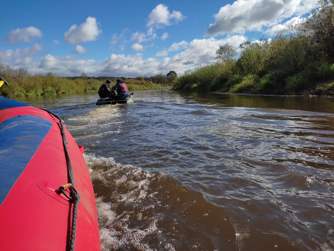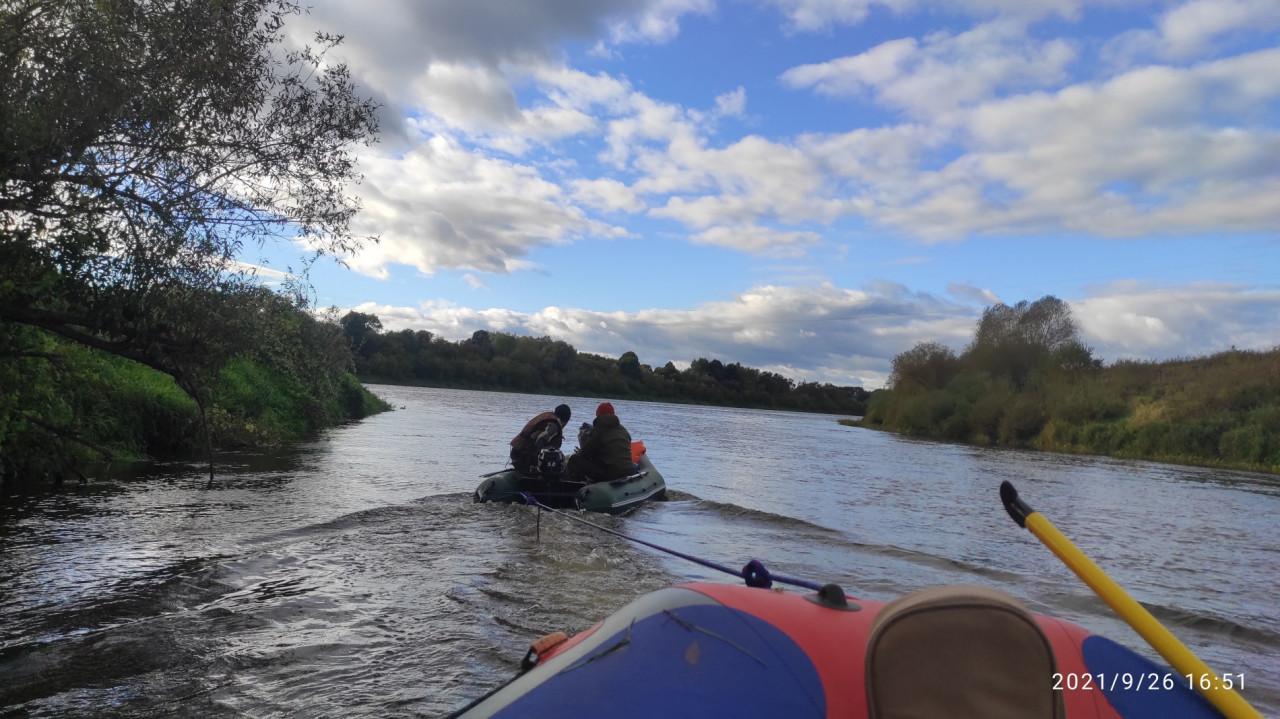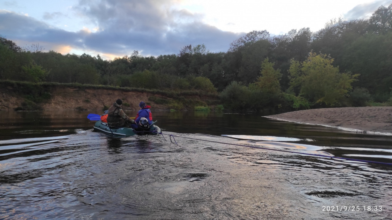 По началу управлять рафтом не получалось, постоянно заносило и разворачивало лодку. Мотор оказался слабым, казалось, вот-вот и сломается. Периодически наматывались на винт то водоросли, то буксировочная веревка. Промучившись с пол часа, плюнули взялись за весла. Но на веслах в груженом рафте далеко не уйдешь. Он тоже не очень хотел идти. Пошли шутки, что поход перестает быть «пенсионерским». Где-то через 2 километра решено было попробовать буксировать рафт моторной лодкой снова. То ли консультации Глаза по вайберу, то ли стойкое нежелание снова браться за весла привнесли свою лепту, то ли «дело было не в бобине», но процесс пошел, лихо пошел. Можно было уже начинать наслаждаться всеми прелестями пенсионерского похода.
