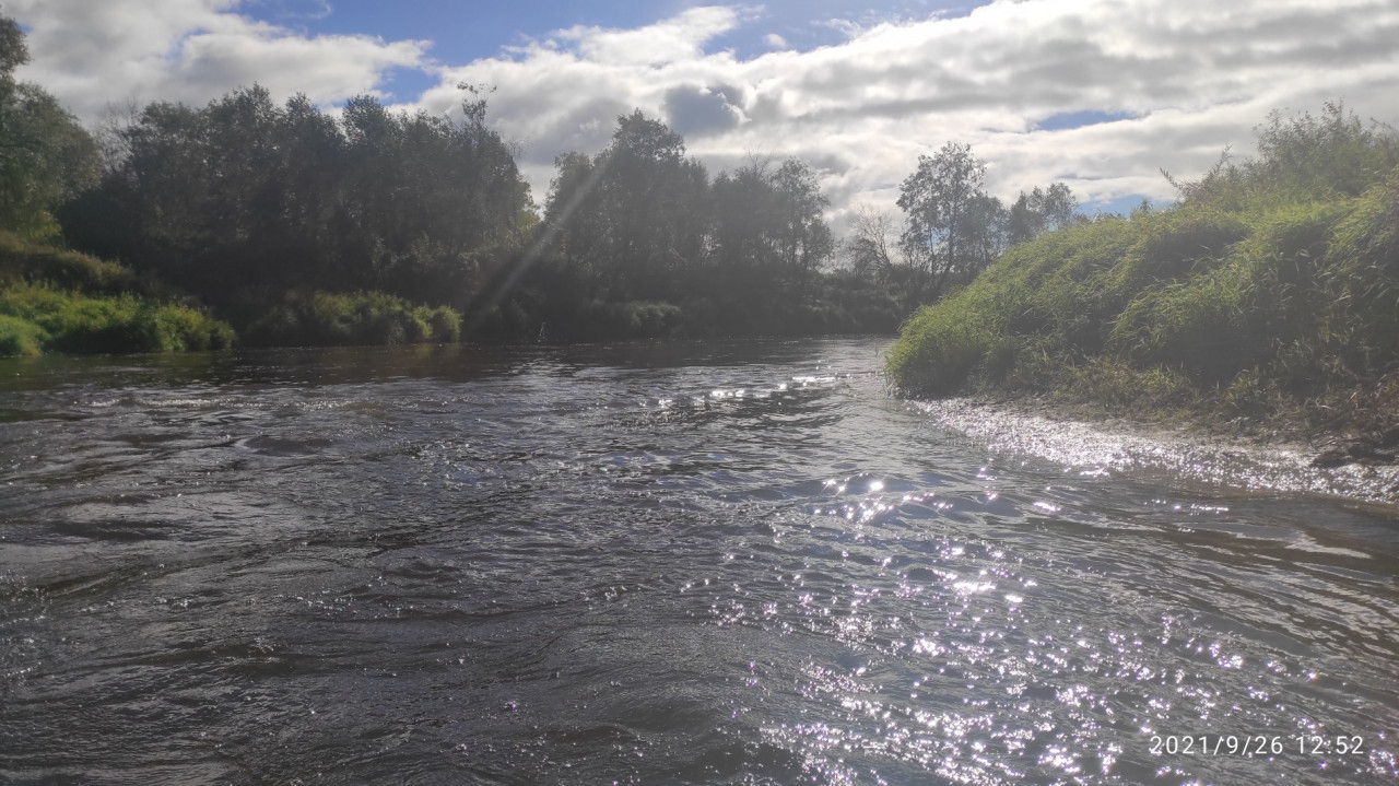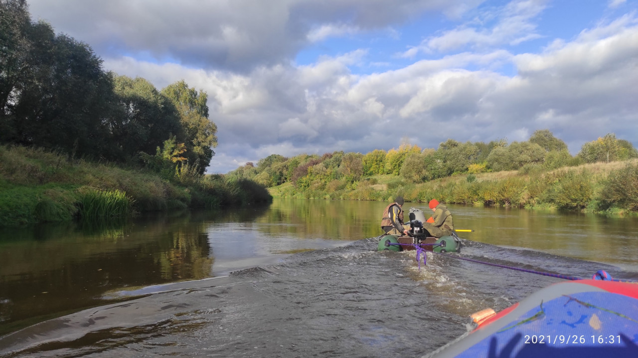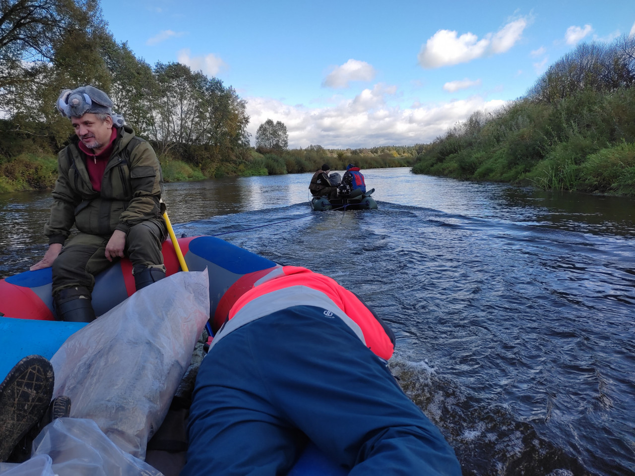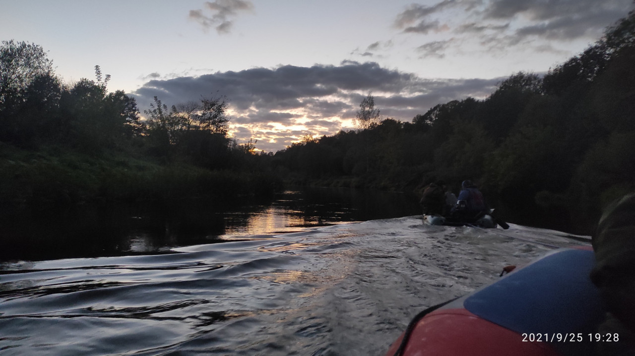 По началу управлять рафтом не получалось, постоянно заносило и разворачивало лодку. Мотор оказался слабым, казалось, вот-вот и сломается. Периодически наматывались на винт то водоросли, то буксировочная веревка. Промучившись с пол часа, плюнули взялись за весла. Но на веслах в груженом рафте далеко не уйдешь. Он тоже не очень хотел идти. Пошли шутки, что поход перестает быть «пенсионерским». Где-то через 2 километра решено было попробовать буксировать рафт моторной лодкой снова. То ли консультации Глаза по вайберу, то ли стойкое нежелание снова браться за весла привнесли свою лепту, то ли «дело было не в бобине», но процесс пошел, лихо пошел. Можно было уже начинать наслаждаться всеми прелестями пенсионерского похода.