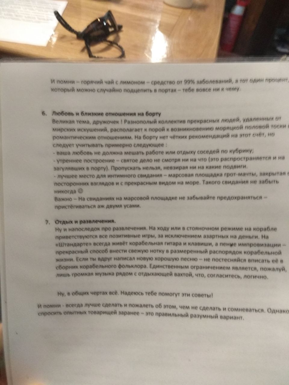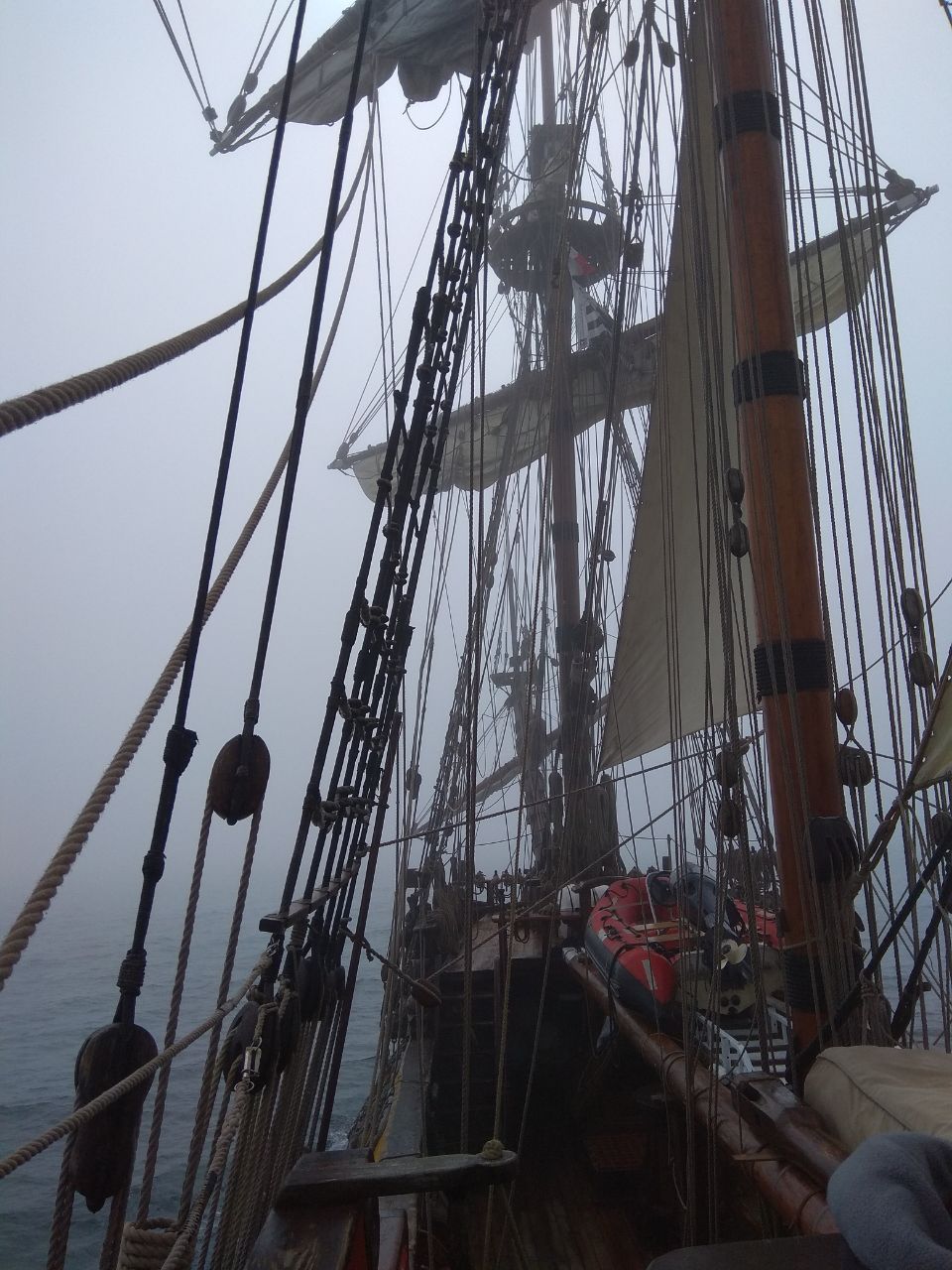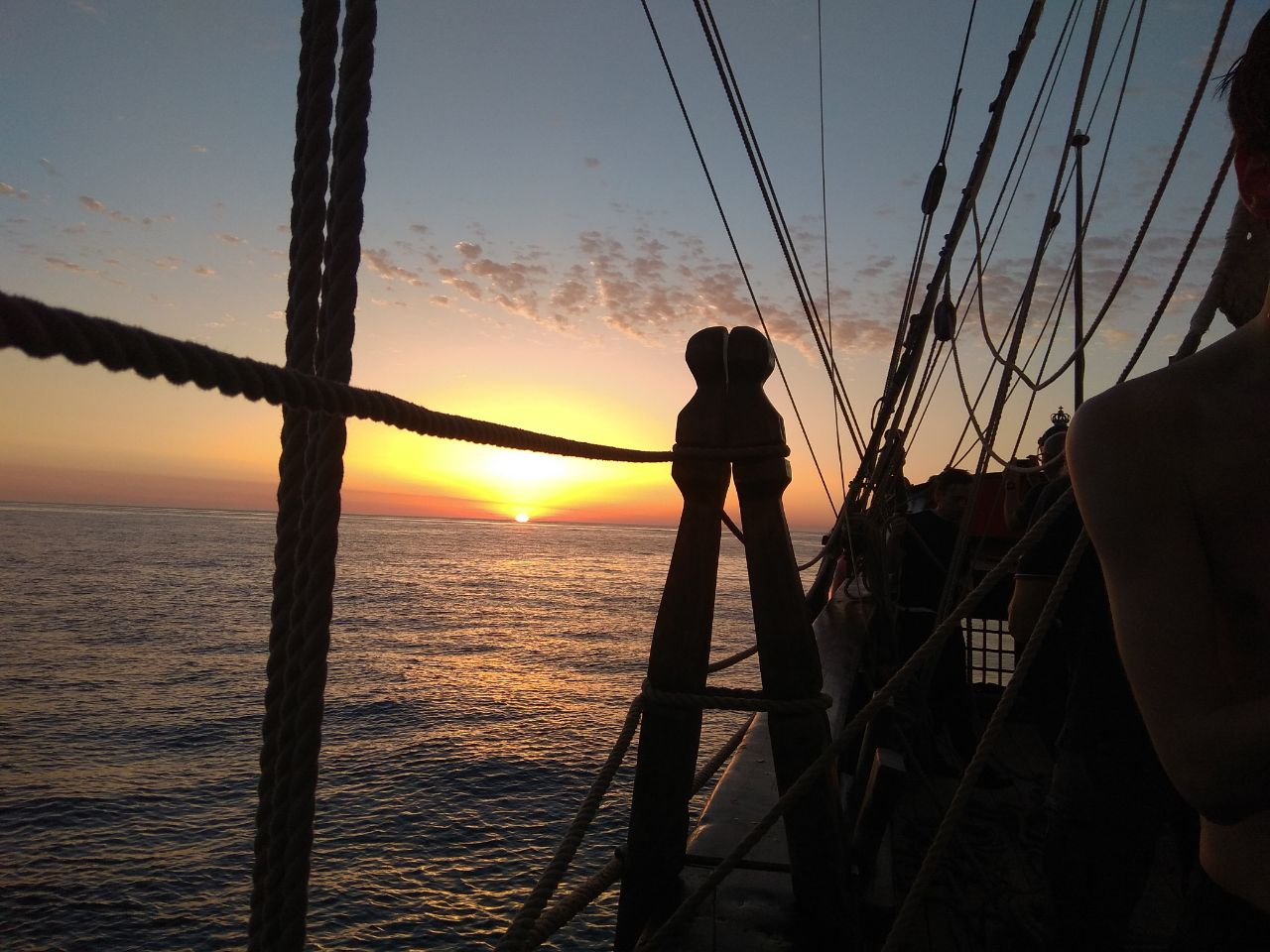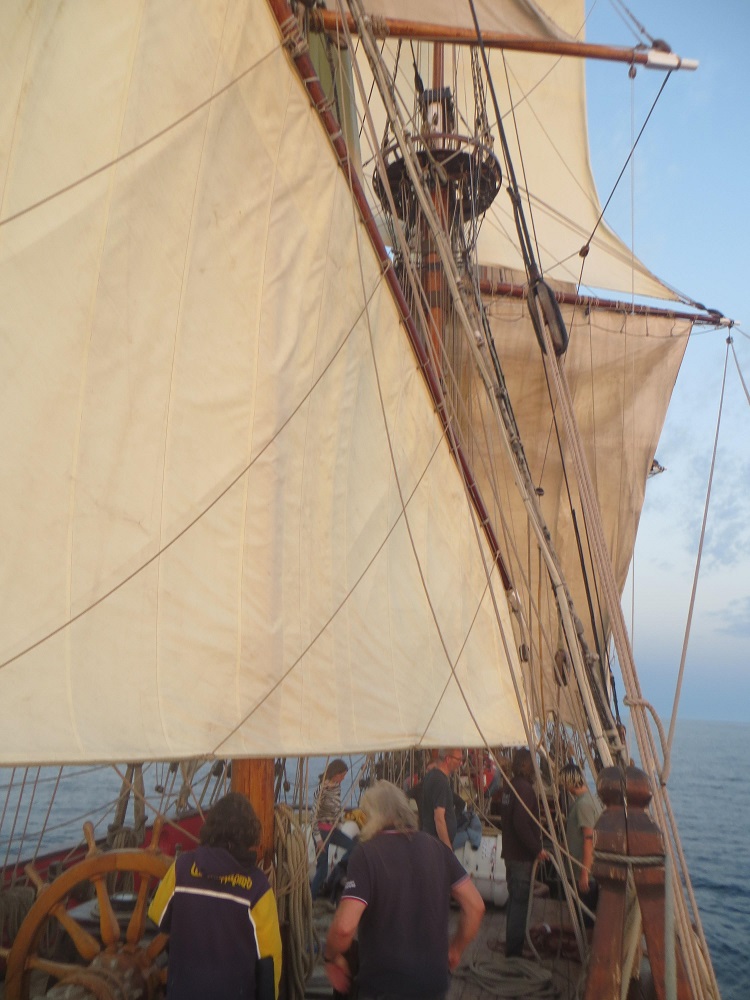 Ночью на вахту, в 00.00 уже должны быть наверху… чистое звездное небо от края до края, и паруса раскачивающиеся на их фоне.. плеск светящихся волн, они действительно светятся, дельфины проплывающие на расстоянии протянутой руки, буря начинающаяся небольшим серым пятном на горизонте, и в считанные минуты превращающаяся в затягивающую пол неба тучу которую соединяют с поверхностью моря длинные извивающиеся молнии…Масса эмоций которых просто не передать словами, но все это заканчивается,