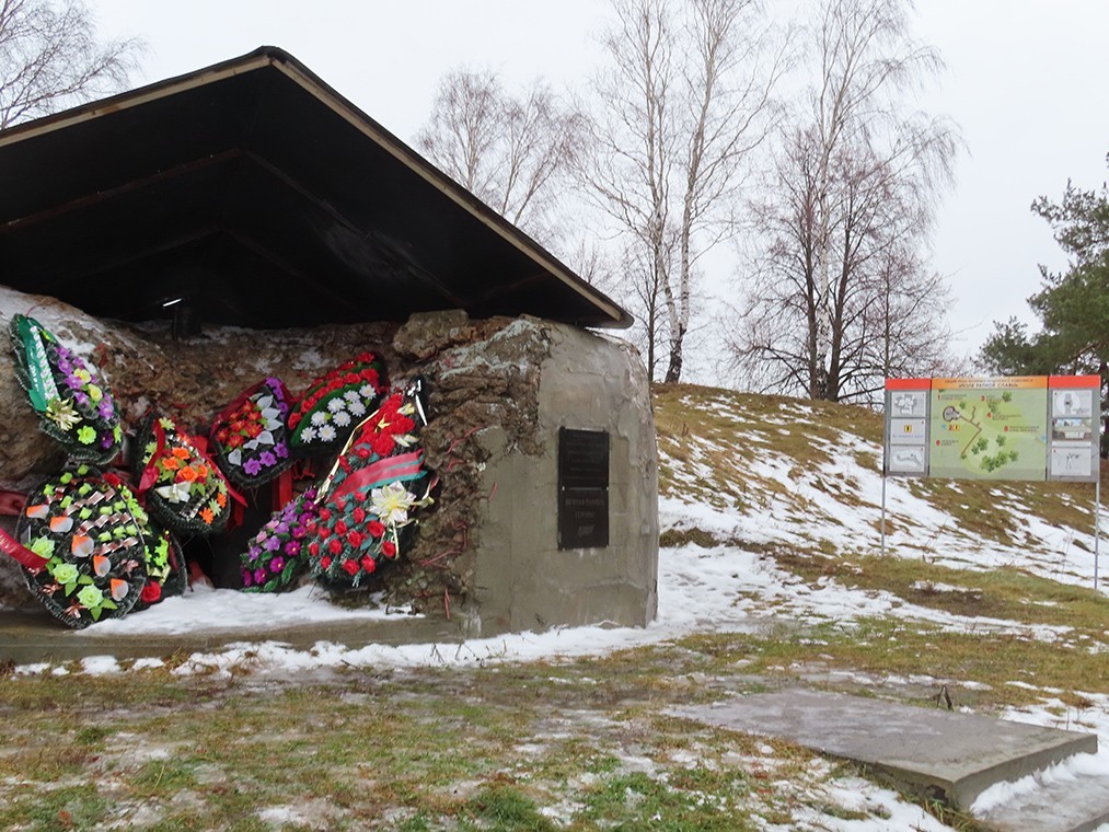 На окраине посёлка Гомельское лестничество, дальше весёлый спуск по обледенелой дороге к реке Турчанка. Справа остаётся Гомельская ГЭС, и при повороте налево открывается мемориал. Центральное высокое место занимает сдвоенный дот, тыловой части которого все и поклоняются. Условно он замаскирован под навес.