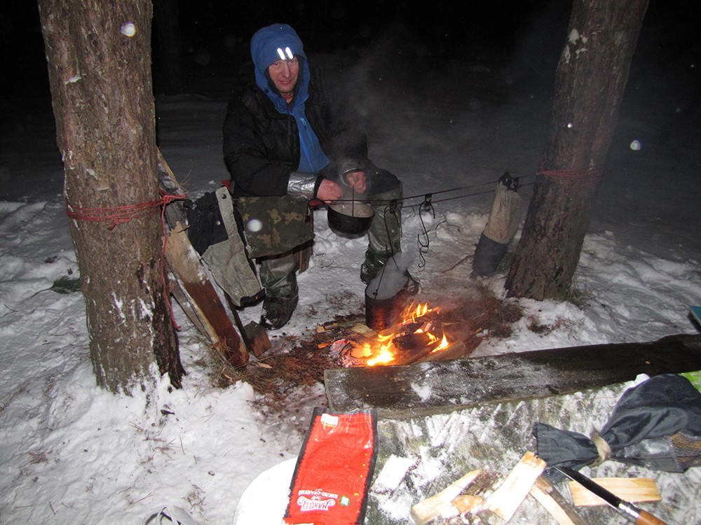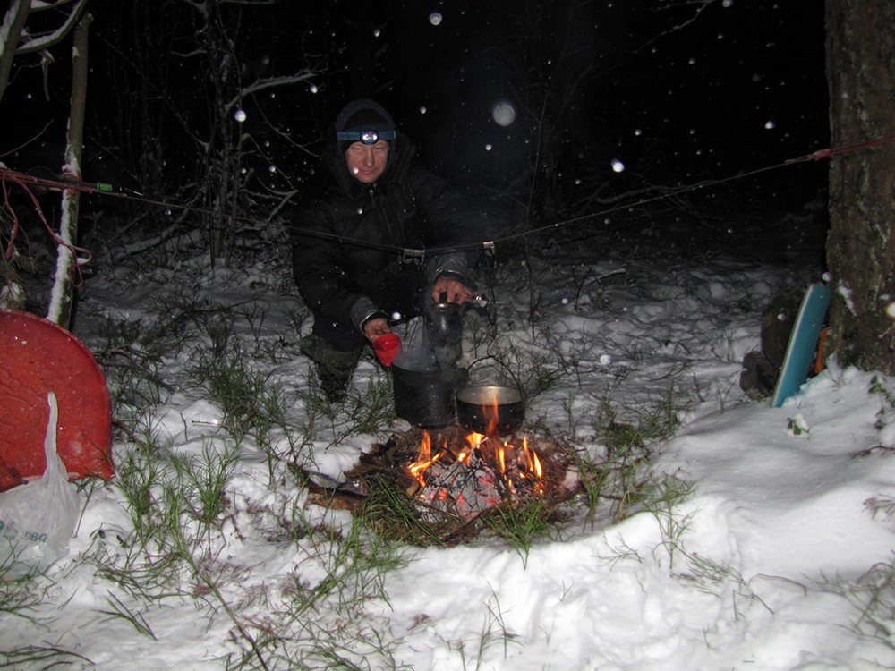 3.01.2022 г. Утро в кромешной темноте. Идёт снег. Слой свежего снега около 15 см. На отщепах развожу костёр.