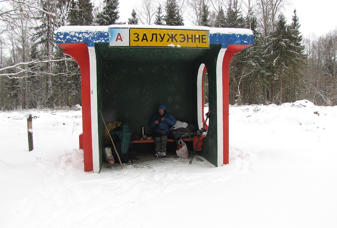 Дальше по ходу деревня Усвея, переходящая в Двор Усвеи. Появился след одинокой легковушки, потом их в колее стало несколько. За Двором Усвеи дорога уже расчищена. Теперь двигаемся быстрее и экономнее. Но счастье оказалось мимолётным, пару км. Поворот на д. Залуженье, и идём по автомобильной колее в снегу опять. За северной окраиной решили изменить трек. Прямая дорога узкой ленточкой саней подозрительно заманивает в очередную пахоту. Решаю сделать крюк через д. Залуженье на юг к трассе Р113, и уже по ней вернуться к первоначальному варианту. На трассу вышли и на остановке устроили перекус.