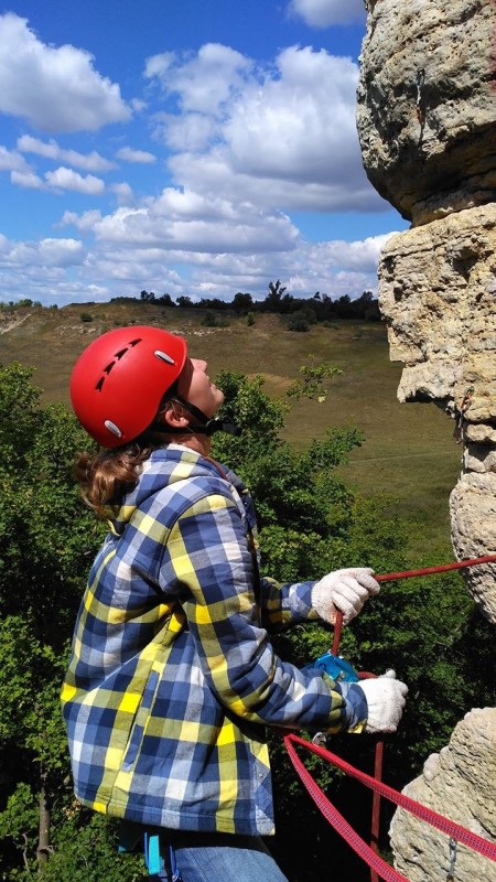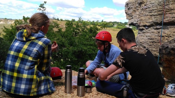 Массив “Звонари” не очень большой, но на разный вкус - присутствуют и 5-ки и 6-ки и 7-ки. Следующий день мы провели на секторе А - привыкали к скалам и отрабатывали лазание с нижней страховкой. Тут находятся комфортные 5-ки и 6-ки. Ребята на практике оценили необходимость надежно пристегивать снаряжение - 3 раза улетало страховочное устройство Гри-Гри, благо, недалеко).
