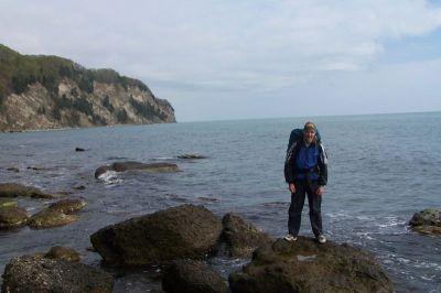 Идем по трассе, зажатой в клещи между песчаным пляжем и подступающими к самой воде Кавказскими горами.