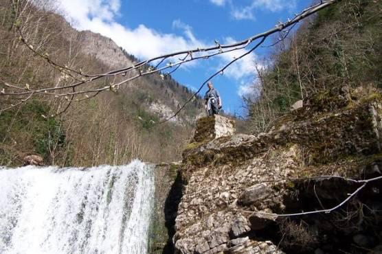 Мы переходим через навесной мостик, и выходим к красивейшему водопаду. Две могучие скалы обрамляют мощный поток, свободно падающий на мелкие зубцы, торчащие внизу. Как по мановению волшебной палочки, дневной ветерок уносит белесую массу, накрывшую нас, и мы снова можем видеть камни во всем их очаровании. Невозможно передать цвет воды. Не мутно-коричневая масса взбесившейся по наводнению реки, не прозрачная струйка горного ручья из только что растаявшего ледника, но голубовато-бирюзовая, будто бы подкрашенная акварелью гладь. И в каждом блике отражается прошлое и будущее.