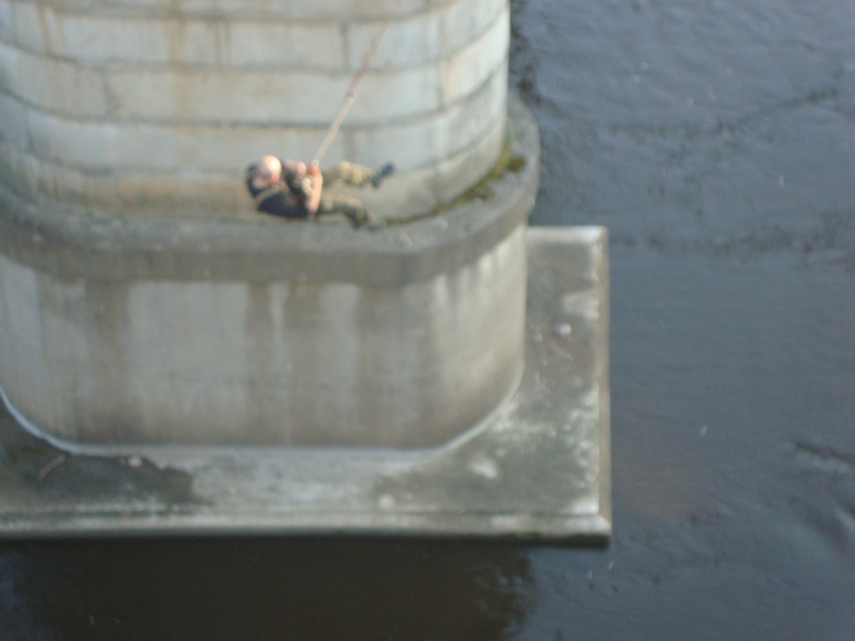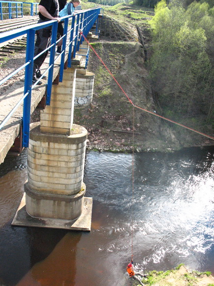 При кажущейся перспективности моста на поверку оказался он далеко не самым удачным. Всему виною по центру стоящая опора. Как ни натягивай диагональную динамическую базу, влететь можно или в эту опору или в берег слева – река здесь в глубоко врезанном углублении. Гомельский аппарат изобрел базу СУРФ. С Уменьшенным Фактором Рывка. Диагональная база из двух контуров. Каждый контур – глухой конец, фиксированный за парапет с одной стороны и за одинарный полиспастный ролик с другой. Другой же конец от дерева снизу и перекидывается через этот ролик. Прыжок выходит, что не на отдельном усе, а на конце элемента контура (та веревка, что от дерева перекидывается через ролик). Амортизация за счет натяжения динамической веревки. Фиксация у дерева за рогатые восьмерки. Чтобы опустить на землю прыгающего, оттуда потом, от дерева, веревки и сдаются.