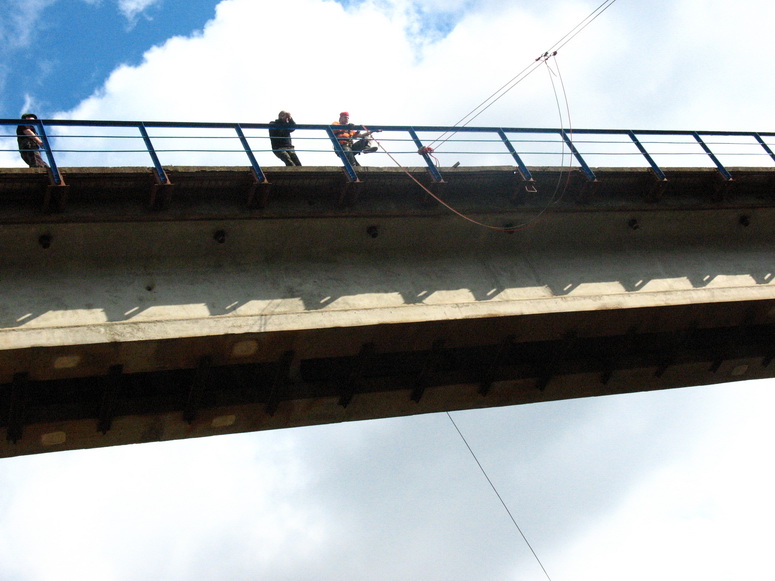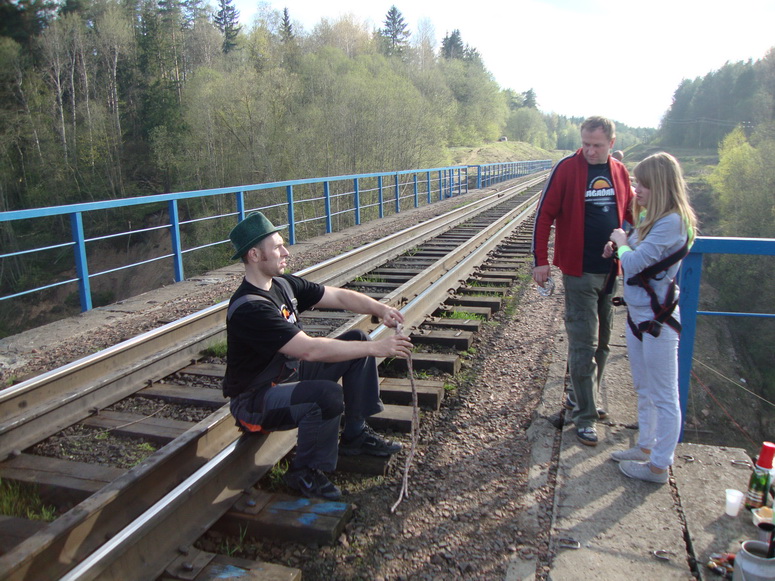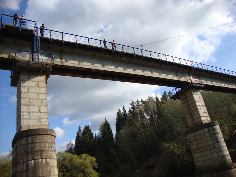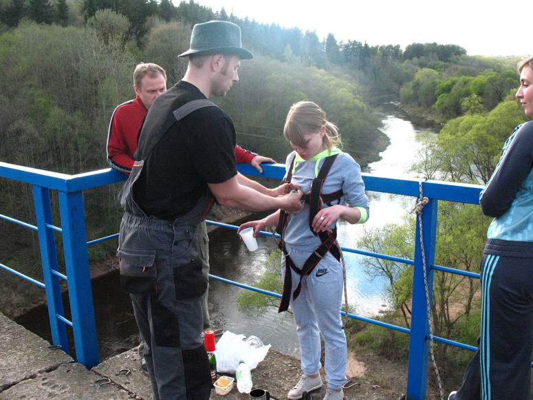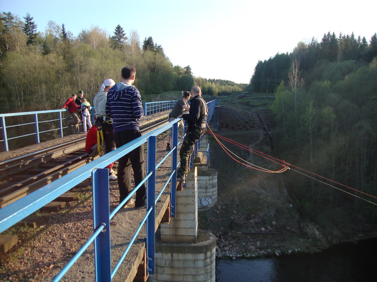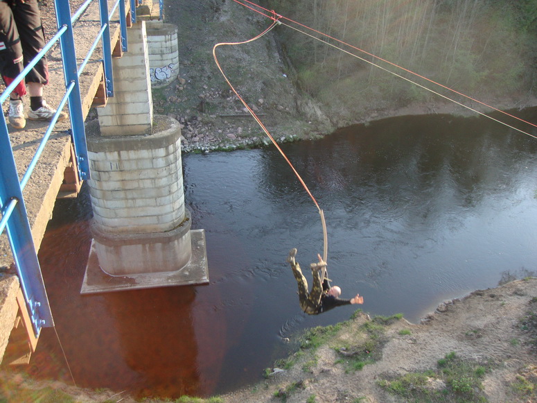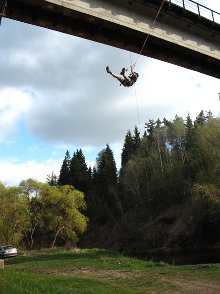 Зачем же прыгать. Взрослые не первой мы уже молодости люди, чтобы заниматься таким дебилизмом. Страшно перелазить и оказываться по ту сторону перилл. Страх вполне физиологическое чувство перед реальной опасностью. И каждый раз перед каждым прыжком он возникает всё снова и снова. К нему нельзя привыкнуть. Остается через себя перешагивать каждый раз, пренебрегая инстинктом самосохранения, оттолкнуться от перил и упасть вниз! Свободное падение кажется долгим. Но вместо убийственного приземления рывок на маятник. Летишь, и даже поднимает вверх и навстречу чудовищной бетонной опоре. Но не хватает инерции её достигнуть. Мягкие постепенно затухающие колебания и спуск на землю.