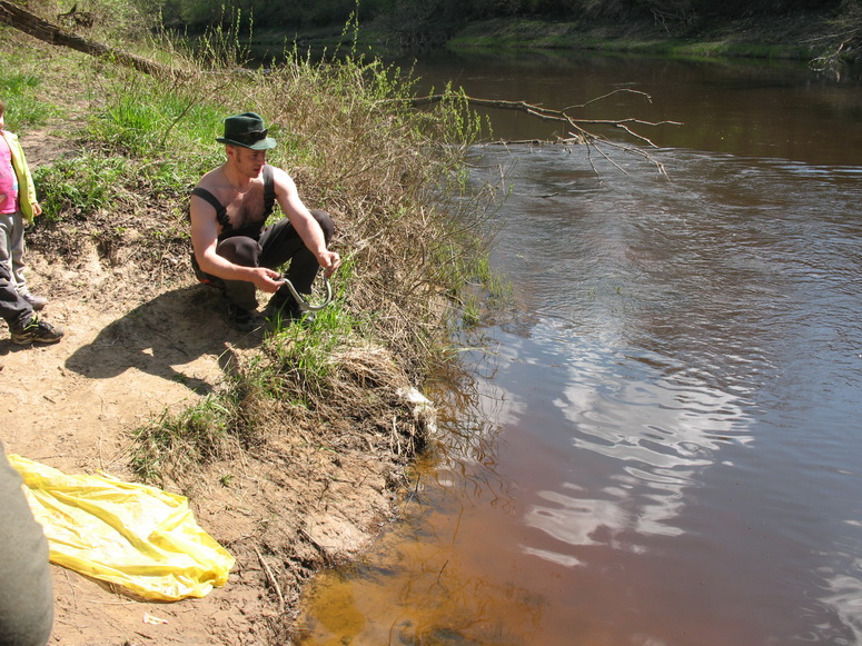 Конец апреля пора змеиная. Еще не поднялась трава, гады выползают погреться на солнышко. Глаз с помощью превосходной рогатины изловчился и словил крупного шипящего ужа. К ужасу женщин и восторгу детей уж извивался жирно-блестящим перламутровым брюхом блонд, всячески пытаясь высвободится из пальцев. Его бросили в реку. Змей поднял голову, осмотрелся и быстро поплыл к противоположному левому берегу.