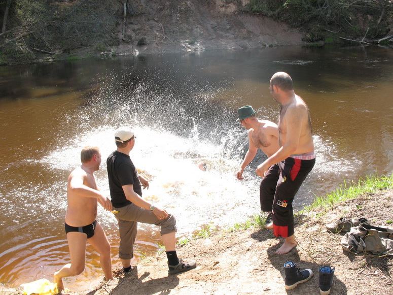 Поддали больше. Декомпенсировался Ашик и принялся разводить ашизм и могилевщину. Его подхватили, раскачали и вбросили в Лучесу. Водные процедуры тонизируют и являются профилактикой ряда недугов души и тела. Странным образом успела прогреться вода, что вполне можно было уже купаться. Каких считай две недели назад мы купались в Цнянском водохранилище, так там такой дубак был… А тут плавать можно было свободно.