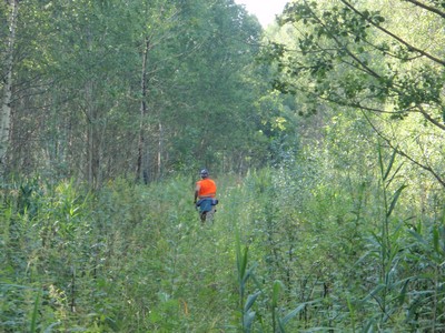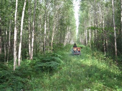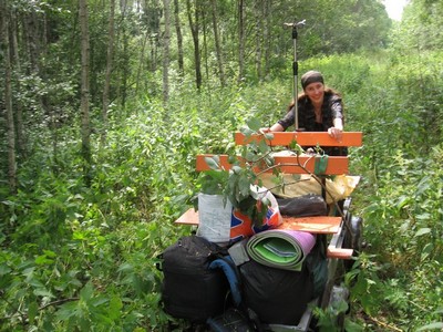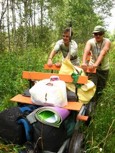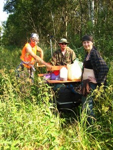 Через 5-10 минут смех и начальное веселье умолкают, начинается монотонная ломота. Я, Слава, Артем ожесточенно толкаем нашу тележку с мотором вперед, Люба идет то сзади, то спереди и фотографирует, периодически останавливаясь в зарослях ягод попастись.