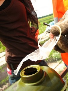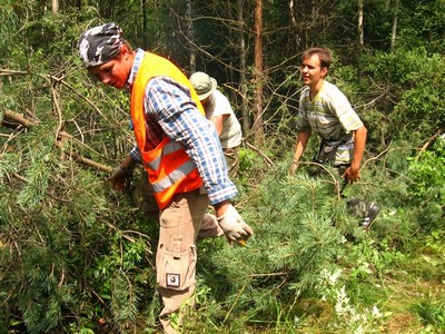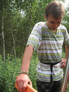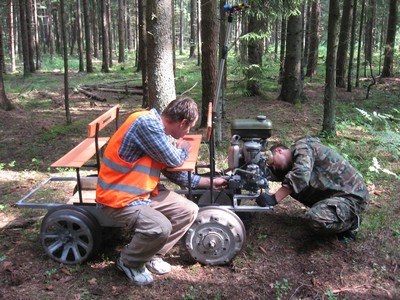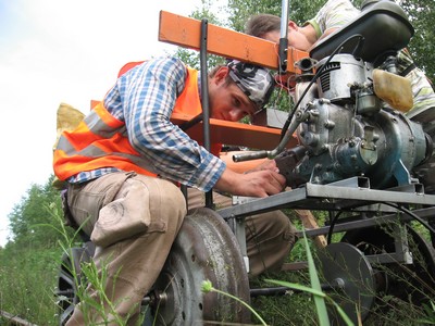 Дернули ручку зажигания. Др-р-р! - сказала лесопилка и заткнулась. "Ага!" - сказали суровые минские мужики и начали снова колупать двигатель. Разобрали карбюратор. Коллегиально Артем и Слава приняли решение о его технической исправности. Свинтили и поставили на место. Обидно. Рельсы вон из-под травы показались, можно было бы и поехать, да не на чем. Последний раз Артем ездил здесь по осени, но осенью трава уже вся полегшая и нету такого количества насекомых. Группу начало охватывать некоторое уныние.