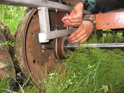 Привод ременный, на заднюю ось. Присутствует также и натяжитель ремня, однако в процессе сборки ремень оказался натянут достаточно, и поначалу ролик натяжителя болтался просто так. Заводить двигатель надо с толкача, помогая небольшой ручкой стартера, торчащей слева от двигателся. Глушиться двигатель размыканием цепи зажигания от кнопки, вынесенной к месту машиниста. Место машиниста - правое сзади. Кнопка глушителя закреплена на деревянной рейке, которая выполняет к тому же роль тормоза трением об обод колеса. Еще раз повторюсь, что более простой конструкции придумать было наверное нельзя. Однако приколы начались прямо на этапе сборки. Что удивительно, раму собрали без трудностей, если не считать некоторый геморрой с установкой осей с колесами, которые крепились скобами к раме, и резьба которых все никак не хотела попадать в отверстия.